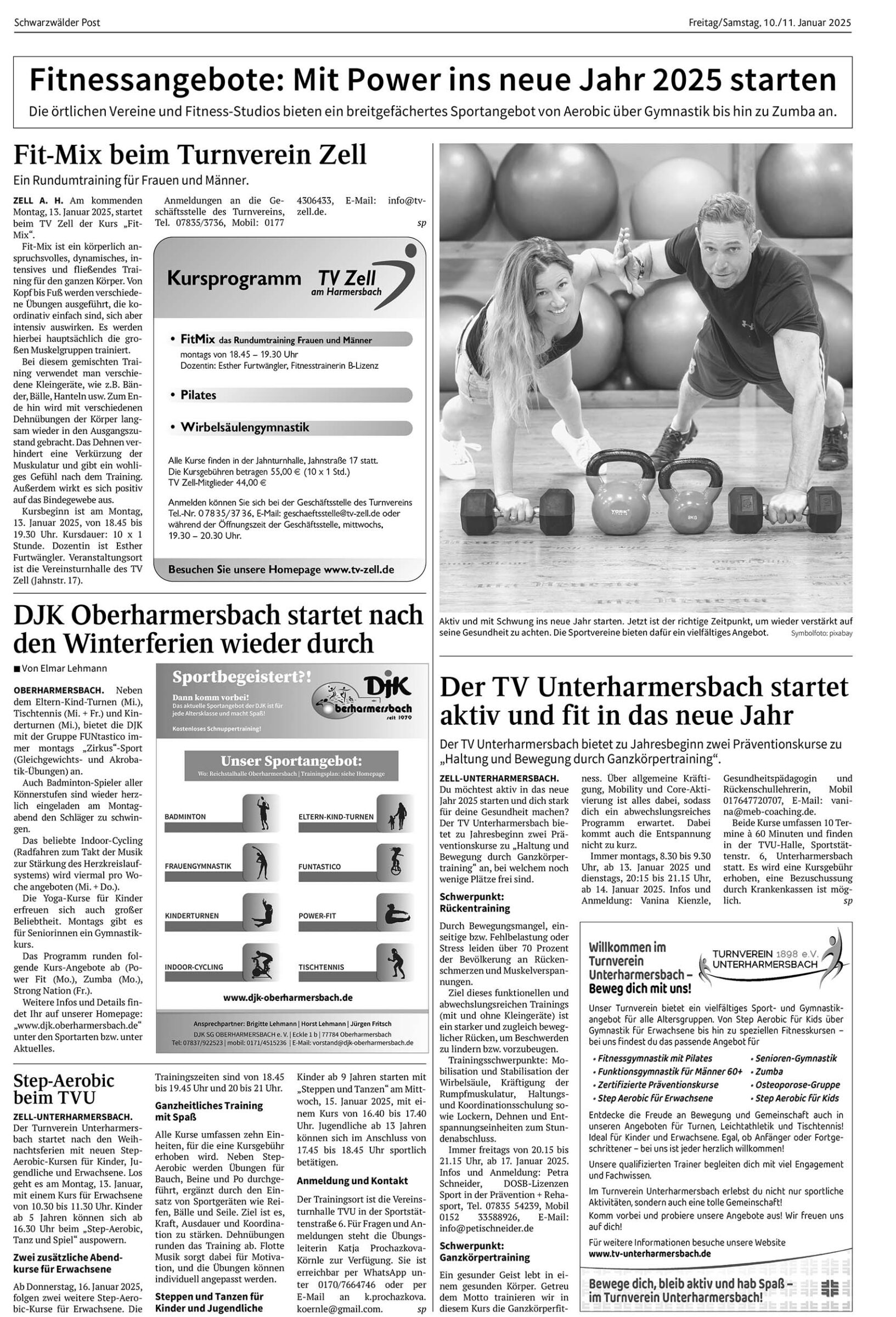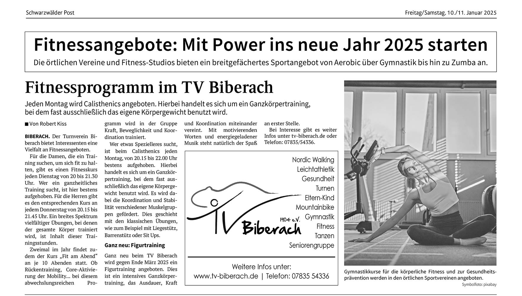 Biberach, Oberharmersbach, Zell am Harmersbach, Zell-Unterharmersbach | 10.01.2025 Fitnessangebote: Mit Power ins neue Jahr 2025 starten von Schwarzwälder PostDie örtlichen Vereine und Fitness-Studios bieten ein breitgefächertes Sportangebot von Aerobic über Gymnastik bis hin zu Zumba an. Foto: Symbolfoto: pixabay Foto: Symbolfoto: pixabay Das könnte Sie auch interessieren:Foto: Reinhold Messner / MundologiaReinhold Messner: „Der Nanga Parbat hat…Foto: privatGoldenes Leistungsabzeichen: Zwei…Foto: VereinToben, klettern, ausprobieren