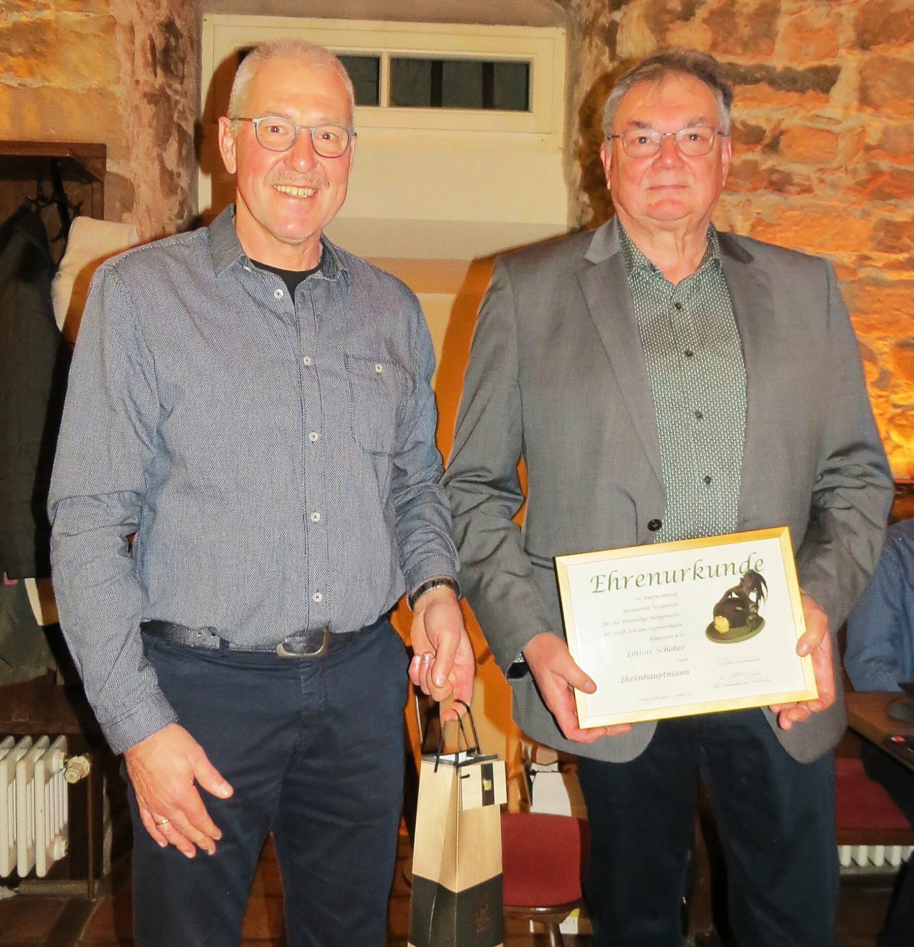 Der bisher stellvertretende Kommandant Lothar Schober hat sein Amt abgegeben. Er wurde zum Ehrenkammandante ernannt und mit viel lobenden Worten von Andreas Lehmann bedacht. „Lothar Schober hat mir den Einstieg zum Kommandanten leicht gemacht und ich bin froh über die tolle Zusammenarbeit mit ihm“, erklärte Lehmann. Er werde Aufgaben für ihn als Rentner finden, sagte er mit Augenzwinkern. Schober erhielt die Ehrenurkunde, Präsente und den sehr lang anhaltenden Applaus seiner Bürgerwehrkameraden und -kameradinnen.