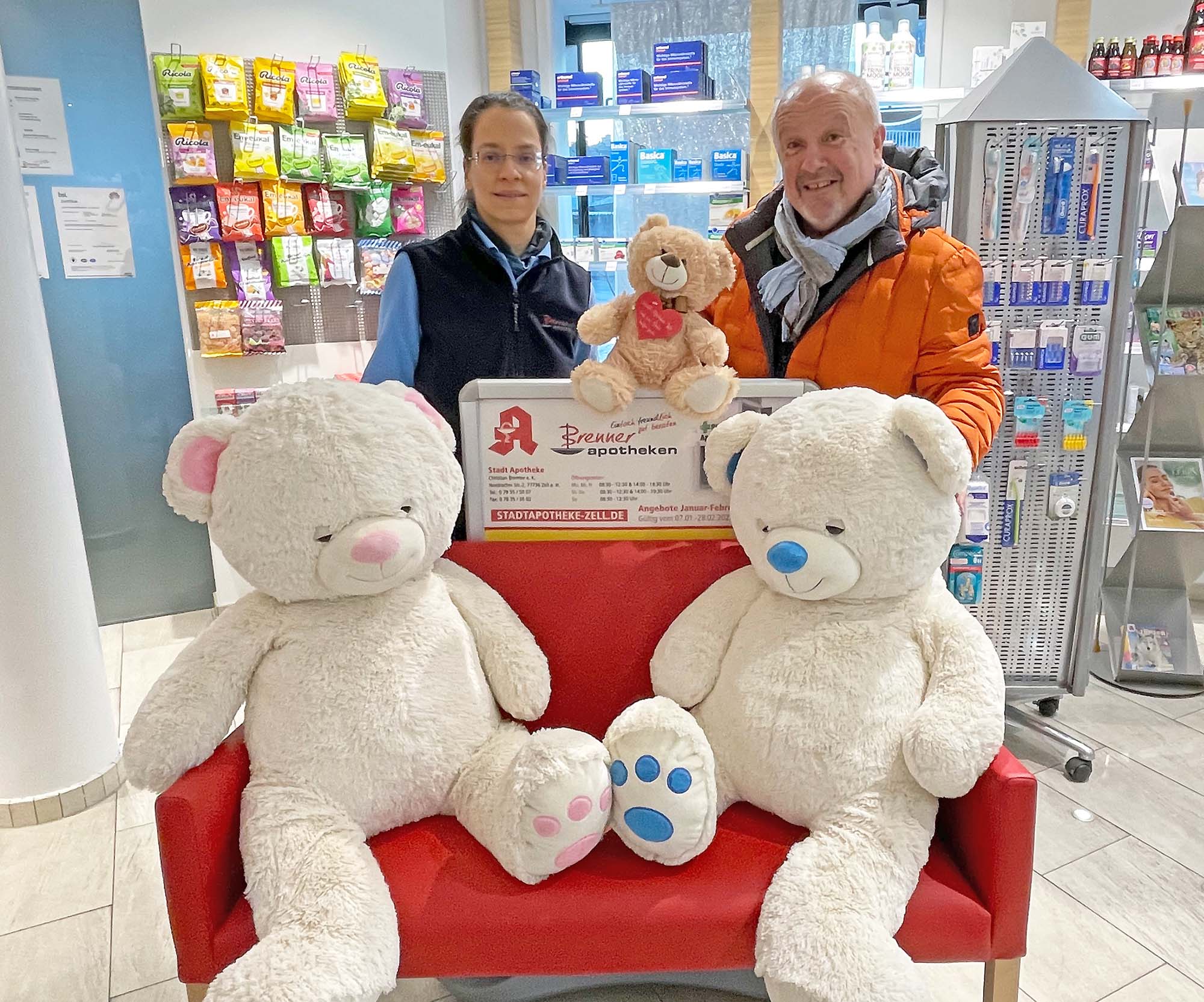 Am vergangenen Dienstag besuchte Erwin Moser die Stadt-Apotheke Zell, um sich persönlich beim Team für die großzügige Spende und den Kauf der Bären zu bedanken. Die Stofftiere sind mittlerweile in den Arztpraxen als kleine „Teammitglieder“ eingezogen und sorgen dort für Freude. Auch in der Stadt-Apotheke werden Kunden nun von einem der Bären begrüßt.