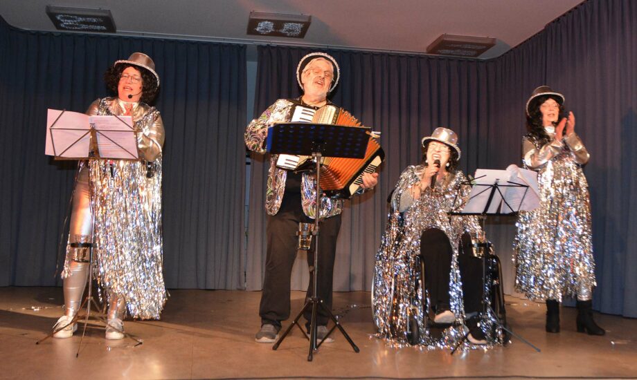 Vor 25 Jahren standen sie als „Grusig bleedi Henne“ auf der Narrenbühne. Dieses Jahr waren sie passend zu ihrem Bühnenjubiläum ganz in silbernes Lametta gehüllt. Erneut sangen sie sich in die Herzen des Neuhauser Narrenvolkes. Allerdings nur zu viert, denn Rita Gutmann musste mit Grippe und ohne Stimme das Bett hüten. Derweil fuhr Gise-la Hug mit einem Rollstuhl auf die Bühne. „Zum Glück bin ich nur aufs Knie und nicht auf die Gosch g‘floge“, scherzte Gisela.