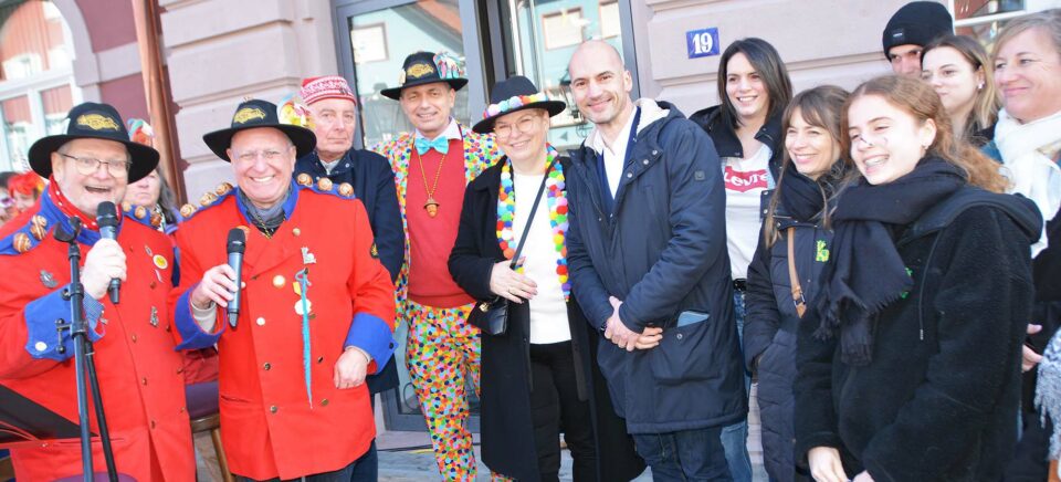Die Basler Grachsymphoniker fehlten dieses Jahr. Sie feiern 60. Jubiläum und hatten sich deshalb für den Auftritt in Zell abgemeldet. Aber die Guggenmusik Simsegräbsler aus Hofstetten sprang zum Glück beherzt ein und brachte die Hauptstraße vor dem Rathaus zum Beben, bis der Umzug dort angekommen war. Die Moderatoren Thomas Dreher und Ulrich Henze führten mit Witz und Wissen durchs Programm. Auf der Tribüne ließ sich neben den örtlichen Honoratioren auch hoher Besuch aus Baumes-les-Dames Platz sehen. Die Tribüne vor dem Rathaus war gut gefüllt mit den französischen Freunden. Bürgermeister, Gemeinderäte, Ex-Bürgermeister – ein ganzer französischer Tross war angereist, um den Zeller Fasendsonntag hautnah zu erleben.
