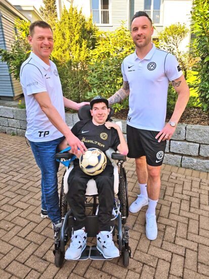 Der Spielball zum Heimspiel gegen die DjK Welschensteinach wurde von Luca Stiewe gespendet und an Spielertrainer Fabian Herrmann (rechts) und Sportvorstand Torsten Pristl (links) übergeben.