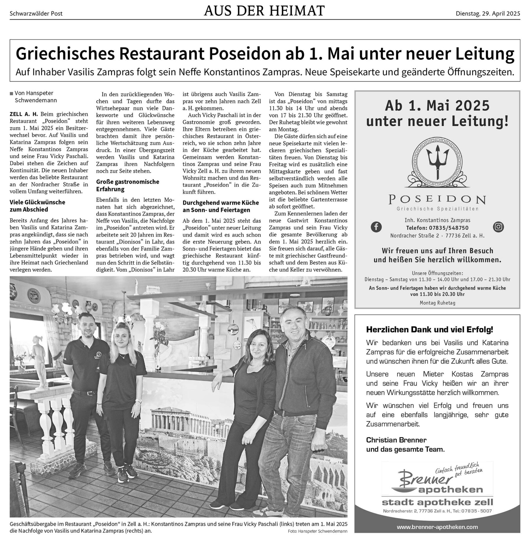Ebenfalls in den letzten Monaten hat sich abgezeichnet, dass Konstantinos Zampras, der Neffe von Vasilis, die Nachfolge im „Poseidon“ antreten wird. Er arbeitete seit 20 Jahren im Restaurant „Dionisos“ in Lahr, das ebenfalls von der Familie Zampras betrieben wird, und wagt nun den Schritt in die Selbständigkeit. Vom „Dionisos“ in Lahr ist übrigens auch Vasilis Zampras vor zehn Jahren nach Zell a. H. gekommen.