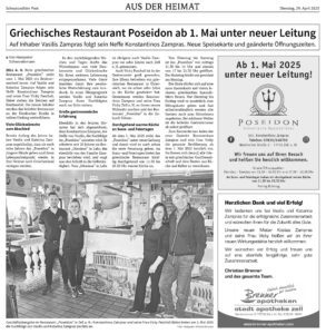 Ab dem 1. Mai 2025 steht das „Poseidon“ unter neuer Leitung und damit wird es auch schon die erste Neuerung geben. An Sonn- und Feiertagen bietet das griechische Restaurant künftig durchgehend von 11.30 bis 20.30 Uhr warme Küche an.