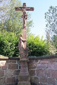 Das Kreuz bei der Zeller Wallfahrtskirche zeigt die Mutter Maria unter dem Kreuz; Stabat Mater.