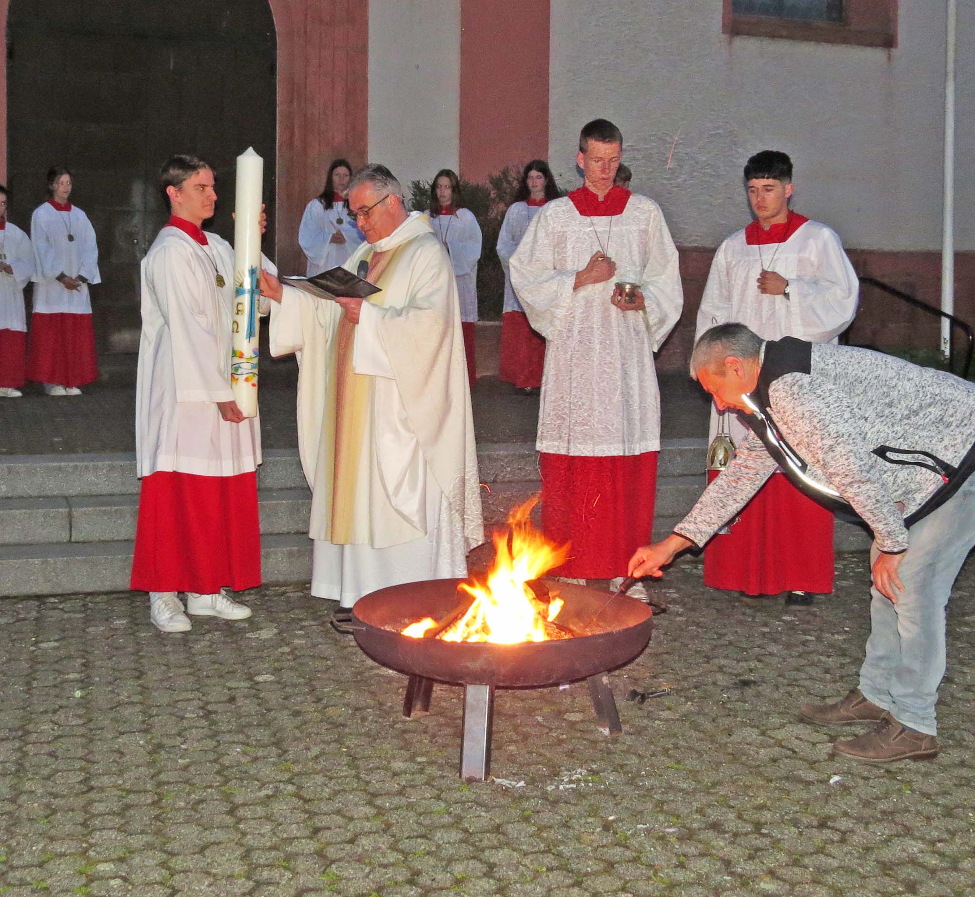 Am Osterfeuer wurde die große Osterkerze entzündet. Danach gingen alle Gläubigen in die dunkle Pfarrkirche hinein. Am Licht der Osterkerze wurden nach und nach die Kerzen in den Händen der Besucher angezündet und dann die Kerzen im Altarraum. Neben der Osterkerze für die Pfarrkirche wird auch eine große Kerze für die Wallfahrtskirche entzündet und eine kleine Kerze für die Michaelskapelle in Grün.