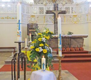 Er sagte weiter, dass wir Ostern in einer Welt feiern, wo uns täglich Schreckensbilder in unser Wohnzimmer geliefert werden. Wir sehen Menschen, die auf der Flucht sind oder durch den Krieg verletzt oder getötet werden. Auch bei uns leben Menschen in Angst oder Sorge um ihren Lebensunterhalt oder anderer Probleme. „An Ostern bricht das Leben auf und der Tod ist besiegt“, wies Gerner auf die zentrale Osterbotschaft hin. Er erinnerte an den Theologen Dietrich Bonhoeffer, der kurz vor Kriegsende in einem Konzentrationslager ermordet worden ist. Von ihm stammt die Textzeile „Wer Ostern kennt, der kann nicht verzweifeln“. Pfarrer Gerner wünschte allen Gläubigen, dass auch in ihnen solch ein tiefer Glauben wachsen möge. „Gottes Zusage vom Licht hilft, er will uns begleiten“, betonte Gerner. Mit diesem Wunsch der Zuversicht beendete er seine Predigt.
