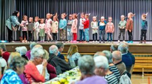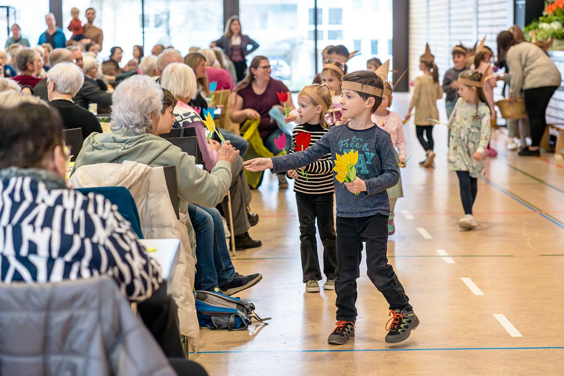 Bei Kaffee und Kuchen, serviert von Mitgliedern des Musikvereins Unterharmersbach, genossen die Seniorinnen und Senioren einen abwechslungsreichen Nachmittag. Den Auftakt gestaltete der Kindergarten Wirbelwind aus Unterentersbach mit fröhlichen Tänzen und einem Gedichtvortrag. Danach verteilten die Kinder selbst gebastelte Blumen im Saal.