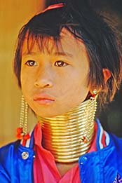 Die Frauen des Kayan-Volkes sind bekannt für ihren auffälligen Stammesschmuck: schwere Spiralen aus Messing, Silber oder Gold, die sie von Kindheit an um den Hals, Arme und Beine tragen. Von Kindheit an, tragen die Mädchen die schweren Messingspiralen, die die Schultern deformieren und den Hals scheinbar verlängern. Erst 1979 klärten Röntgenaufnahmen das medizinische Phänomen auf: Die Halswirbelsäule bleibt intakt, der Druck senkt Schultergülter, Schlüsselbeine und obere Rippen ab, wodurch der Hals optisch länger erscheint.