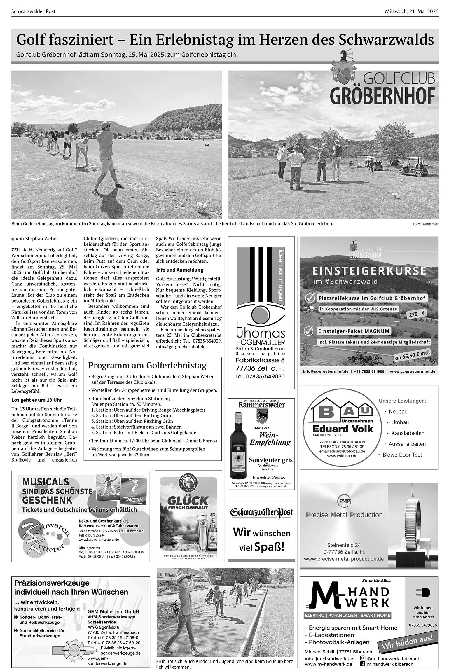 Neugierig auf Golf? Wer schon einmal überlegt hat, den Golfsport kennenzulernen, findet am Sonntag, 25. Mai 2025, im Golfclub Gröbernhof die ideale Gelegenheit dazu. Ganz unverbindlich, kostenfrei und mit einer Portion guter Laune lädt der Club zu einem besonderen Golferlebnistag ein – eingebettet in die herrliche Naturkulisse vor den Toren von Zell am Harmersbach.