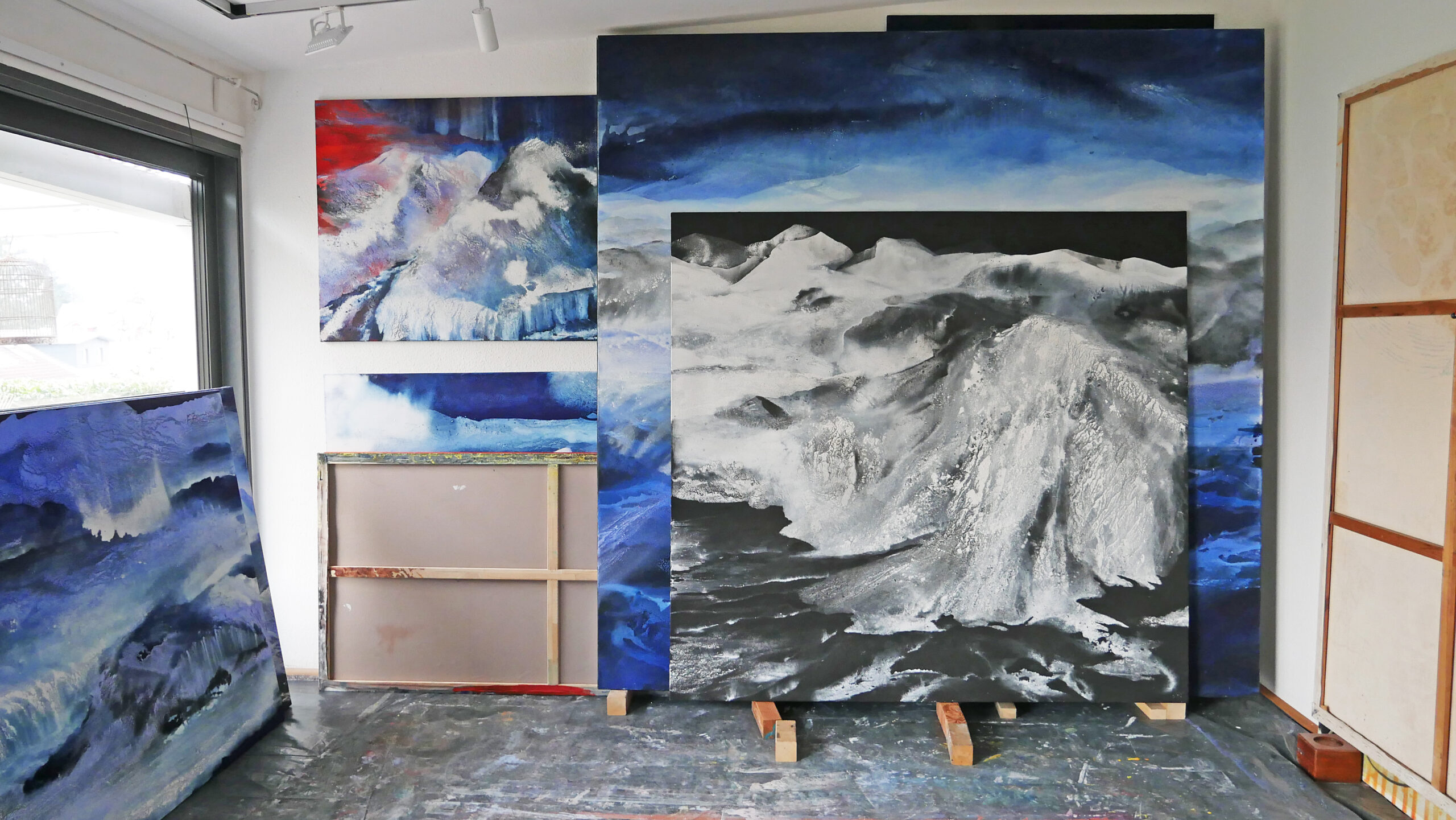Im lichtdurchfluteten Atelier hängen großformatige Landschaftsbilder in Blau, Weiß, Braun, Gelb, Rot und monochromen Tönen. Die Werke fangen die kraftvolle Energie der isländischen Natur ein und spiegeln Hopfs intensive Auseinandersetzung mit den dortigen Landschaften wider.