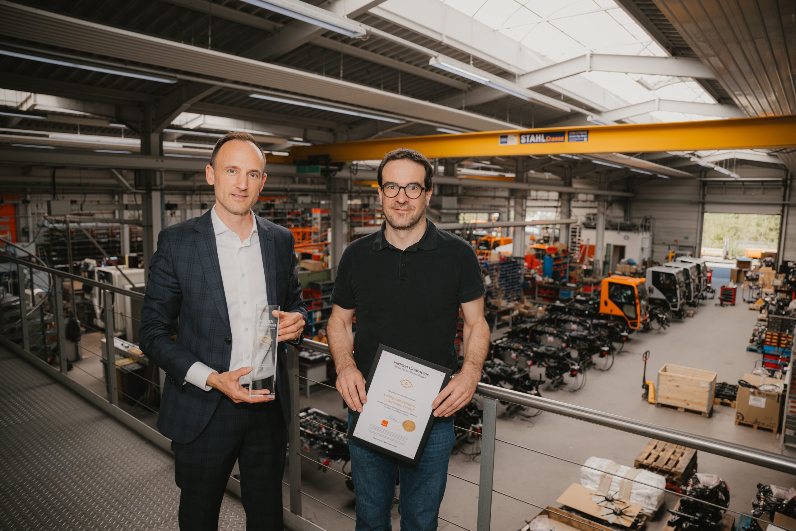 Unter den 43 regional identifizierten Hidden Champions wurde auch das Unternehmen Ladog-Fahrzeugbau u. Vertriebs-GmbH ausgezeichnet. nectanet-CEO Dominik Fehringer übergab eine Urkunde mitsamt Pokal an Geschäftsführer Björn Guggenbühler.