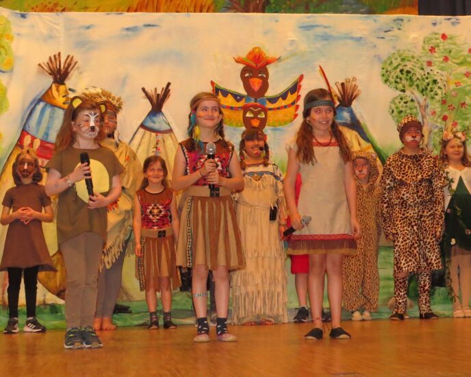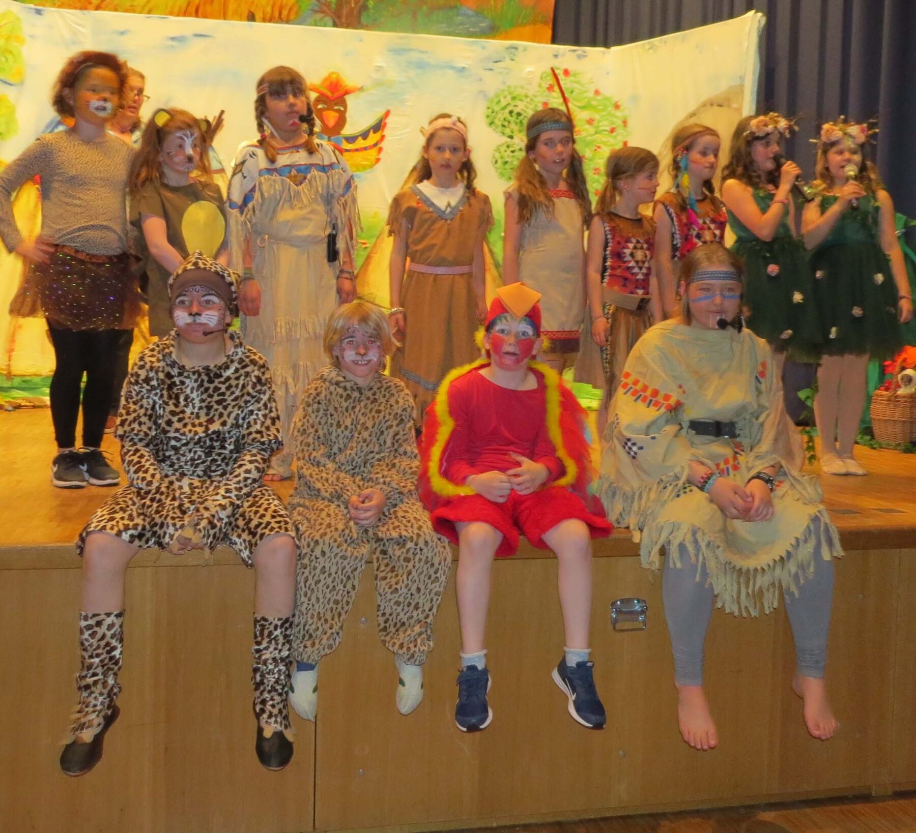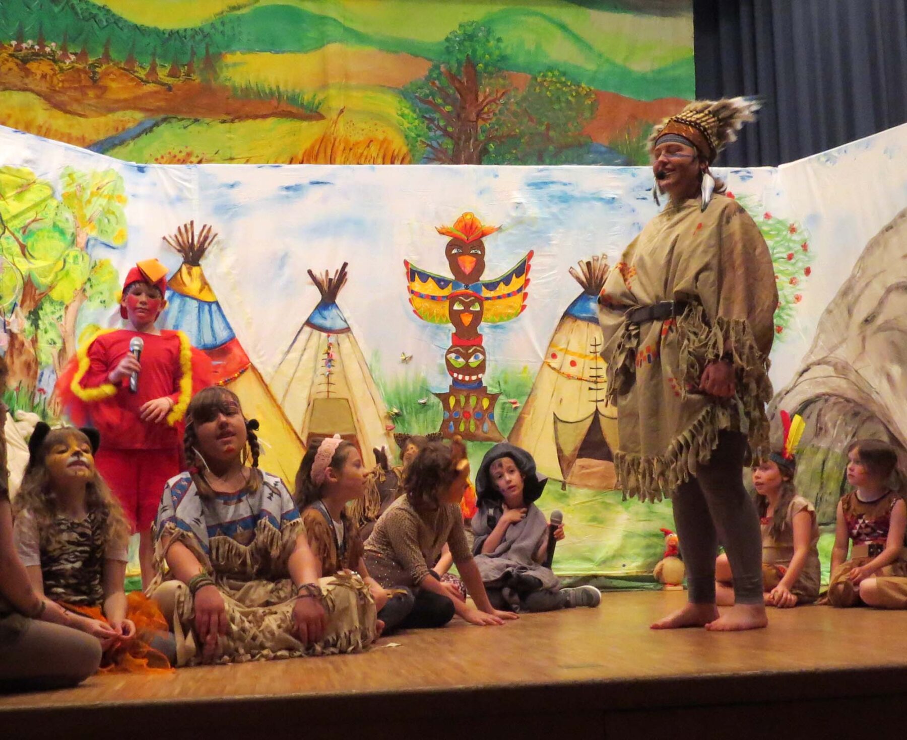 Zur Geschichte gehört auch ein Unterricht durch den Schamanen und den Häuptling; die gefährlichen Tiere aus dem Wald und Streitigkeiten der Akteure untereinander – eine turbulente Handlung. Mit einem ausgelassenen Tanz endet die Aufführung und das Publikum ist begeistert: Die Kinder haben intensiv geprobt und es hat alles bestens geklappt.