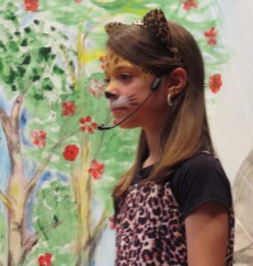 Mit einem schönen Lied „Guten Tag…“begrüßen dann auch die kleinen Schauspieler die Zuschauer – da waren schon mal alle Kinder im Einsatz. Danach sorgt ein Tanz für fröhliche Stimmung und das Publikum klatscht gerne mit. Mit dem Auftritt der Leopardin Sophie beginnt dann die spannende Handlung: Sie ist traurig, weil sie von den anderen geärgert wird und sich nicht traut, etwas zusagen. Allein auf der Bühne singt sie ein trauriges Lied, indem sie ihre Situation beschreibt. Zwei Tiere aus dem Wald haben alles mit angehört, wollen ihr aber nicht helfen. Andere Kinder aus dem Dorf aber schon und sagen: „Hast du Angst, sei ein Löwe und tanze den Löwentanz.“ Das machen sie dann mit Sophie zusammen, doch danach erklärt diese verzagt: „Danke – aber soviel besser fühle ich mich jetzt auch nicht.“