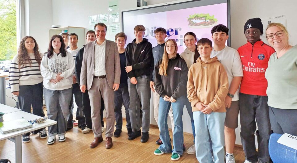 Die Klassen W9a und R9b hatten sich im Unterricht intensiv mit der aktuellen politischen Lage auseinandergesetzt und Fragen aus einem bunten Mix zu Migration, Europäischer Union, politischem Alltag und Schulpolitik zusammengestellt.