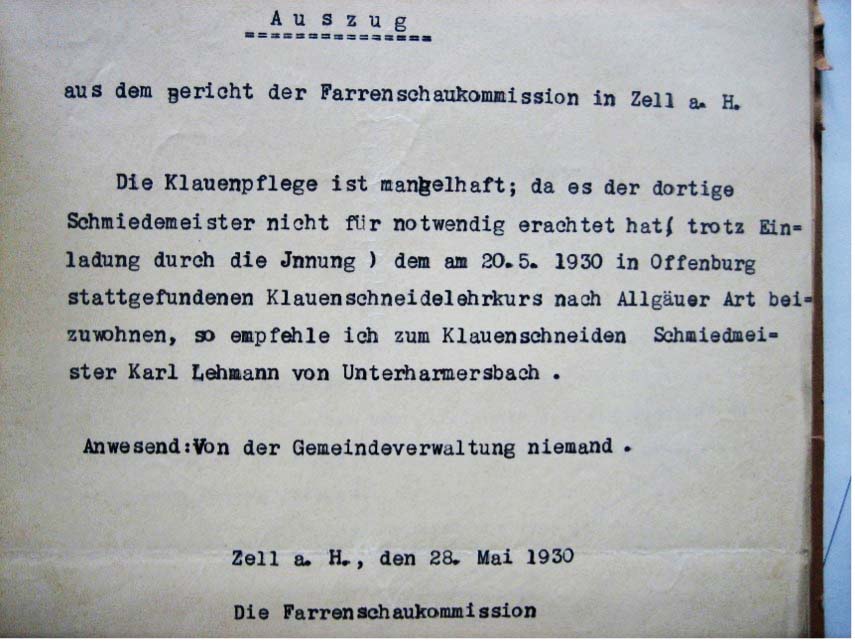Am Ende des Jahres 1899 wurden sämtliche Prämierungen wegen eines Ausbruchs der Maul- und Klauenseuche auf das folgende Jahr verschoben. In den Akten heißt es zudem, dass die Haltung der Farren in Zell und die Aufsicht durch die Farrenhalter vom Bezirksverein beanstandet wurde. Besonders häufig kritisiert wurde die mangelhafte Klauenpflege.