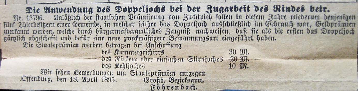 Schon 1888 wurde vorgeschlagen, das sogenannte Doppeljoch durch andere Bespannungsarten aus Gründen des Tierschutzes zu ersetzen. Wer auf das Doppeljoch verzichtete, konnte bei staatlichen Prämierungen für Zuchtvieh mit finanzieller Unterstützung rechnen. Doch das Projekt scheiterte: Die geografischen Bedingungen des Schwarzwalds ließen kaum Alternativen zu. Nur das Doppeljoch – die feste Verbindung von zwei Zugtieren mit einem Gefährt, meist einem Schlitten – bot Sicherheit im steilen Gelände.