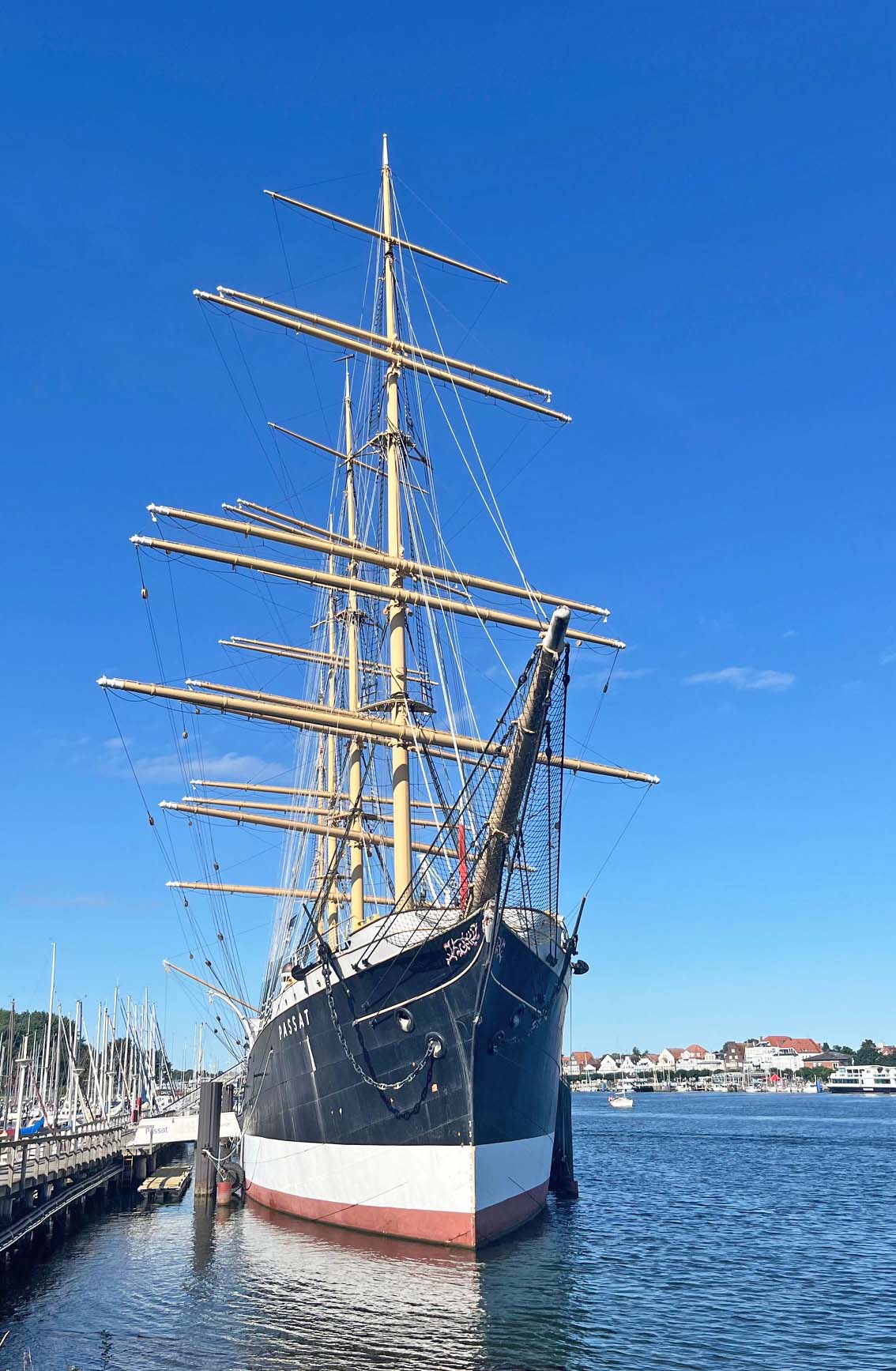Nachdem wir alle Aufgaben an Bord soweit erledigt hatten, gingen wir zur Passat. Der Frachtsegler ist eine Viermast-Stahlbark, die als einer der legendären Flying P-Liner der Reederei F. Laeisz 1911 bei Blohm & Voss vom Stapel lief. Nach der Führung durch das Schiff, das heute als Museum in Travemünde liegt, hieß es jetzt schnell ablegen, bevor die Pier wegen der erwarteten Kreuzfahrtschiffe gesperrt wird.