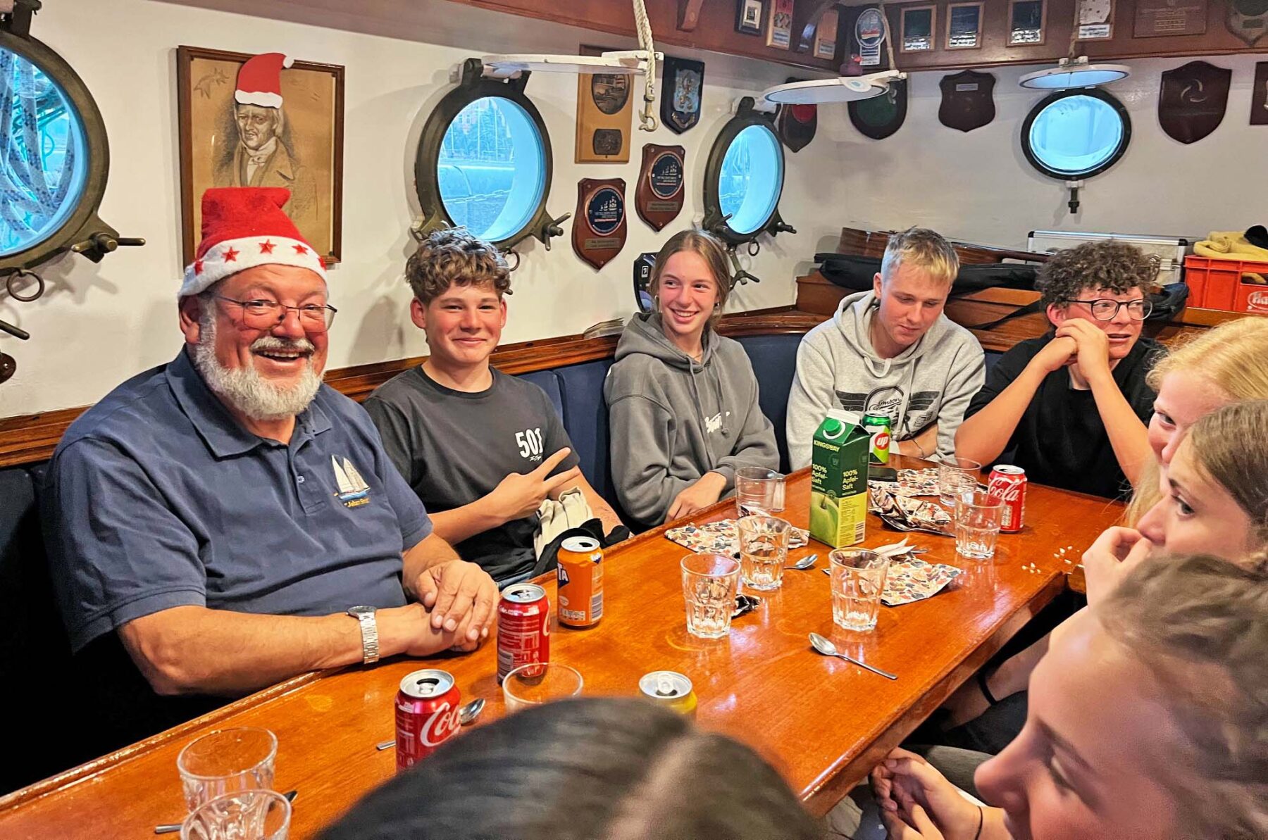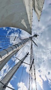 Gegen Nachmittag erreichten wir den Hafen, wo wir sicher anlegten, Schwarzwasser abgaben und Frischwasser tankten. Der Höhepunkt des Tages folgte mit dem traditionellen Kapitänsdinner, das die erweiterte Backschaft gezaubert hat. Es gab knusprige Bruschetta, würziges Curry mit Reis und als krönenden Abschluss rote Grütze mit Eis und Sahne. Das Essen schmeckte vorzüglich, Kapitän Jürgen war sichtlich gerührt und die Stimmung war ausgelassen.