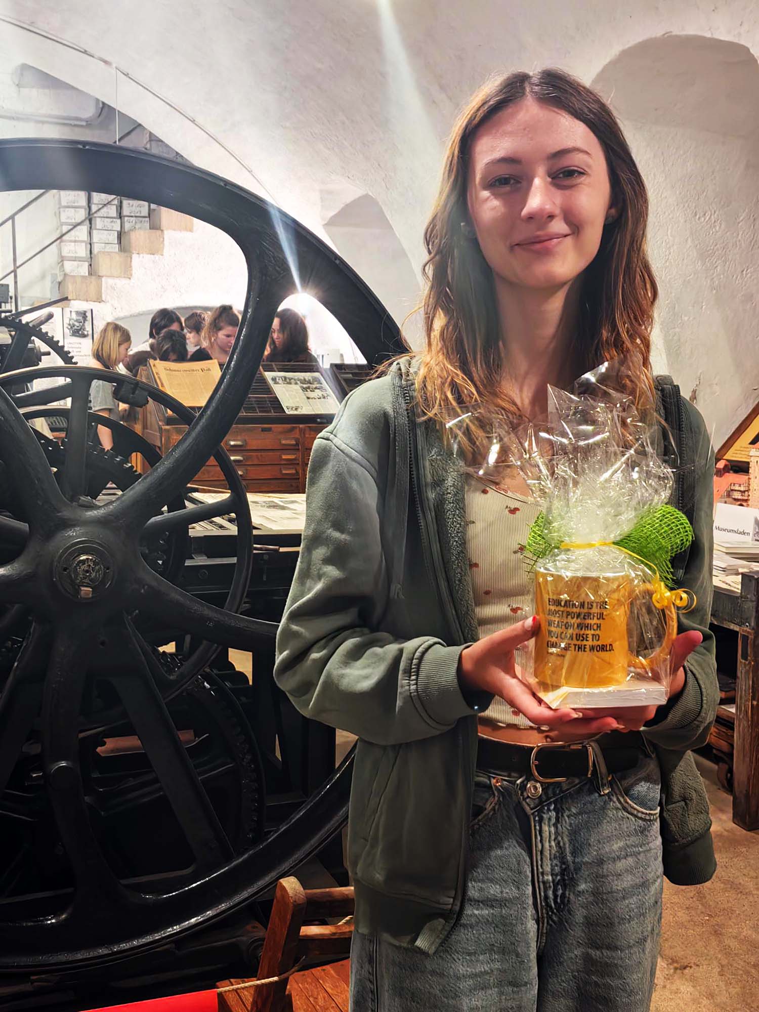 Parallel dazu führte Verleger Hanspeter Schwendemann Kleingruppen durch das Zeitungsarchiv und die Historische Druckerei. Die Schülerinnen und Schüler durften in den Zeitungsbänden stöbern. In die Zeitungen von damals zu blicken – zum Beispiel vom eigenen Geburtstag. Das Blättern in den alten Ausgaben machte sichtlich Freude und zog magisch in den Bann.