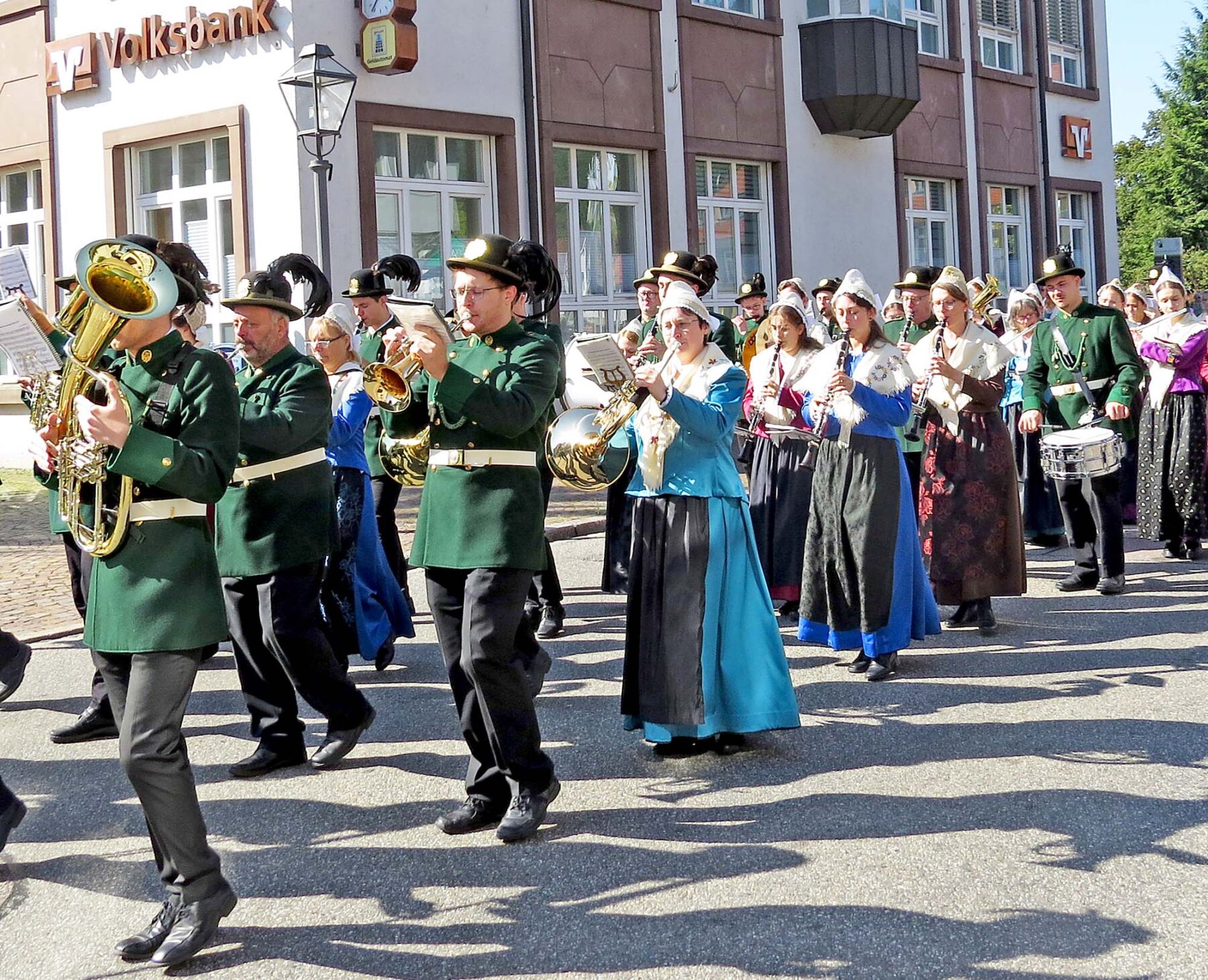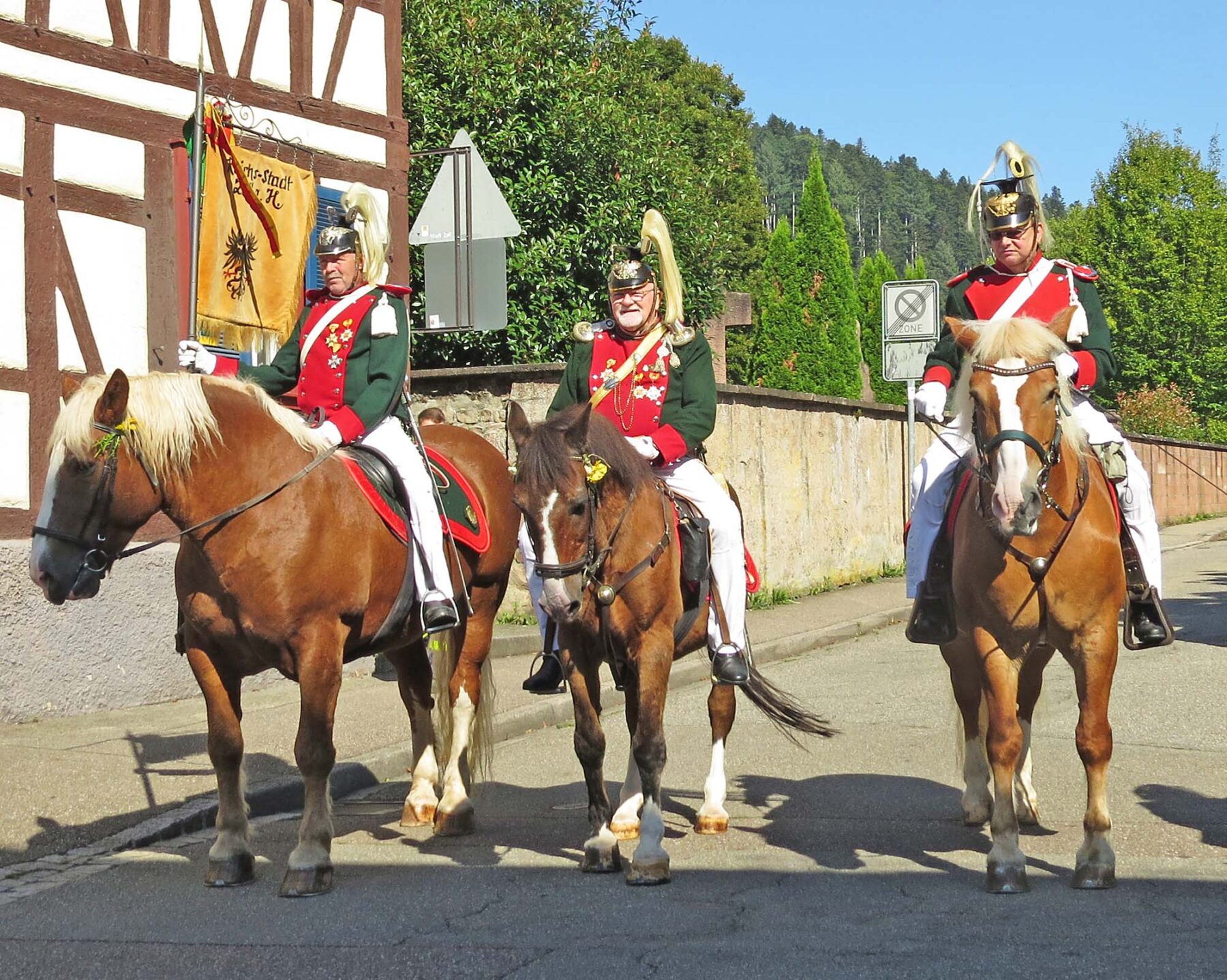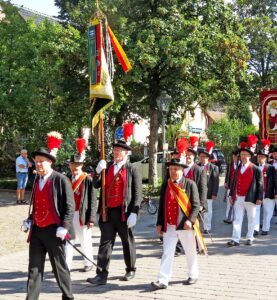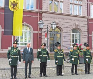 Pfarrer Gerner empfing die Bürgerwehren und Musikkapellen bereits vor dem Gottesdienst vor dem Rathaus. Zusammen mit dem Bürgermeister und den Ortsvorstehern sind die Traditionsvereine sternförmig auf der Hauptstraße eingetroffen. Von dort ging es gemeinsam über die Kirchstraße zur Pfarrkirche.