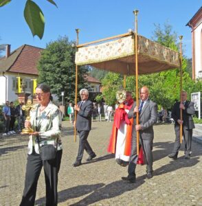 Zum traditionellen Abschluss des Patroziniums ertönte mit der Gemeinde das „Großer Gott, wir loben dich“ von Karl Rüding in der Fassung für Gemeinde, Chor und Orgel. Organist Dieter Friede spielte den feierlichen Orgelpart zur Messe. Am Ende des Gottesdienstes erfreute er mit einem Menuett des französischen Komponisten Léon Boëllmann: dem Menuett aus der „Suite gothique“. Für die feierliche musikalische Gestaltung erhielten die Musiker den lang anhaltenden Applaus der Gemeinde. Pfarrer Gerner sagte am Ende „Danke und Vergelt’s Gott“ an so viele Personen, die an der Vorbereitung und Durchführung des Patroziniums beteiligt waren, dass es eine lange Liste von Namen wurde. Auch diese zumeist ehrenamtlich tätigen Personen erhielten den verdienten Applaus der Gemeinde.