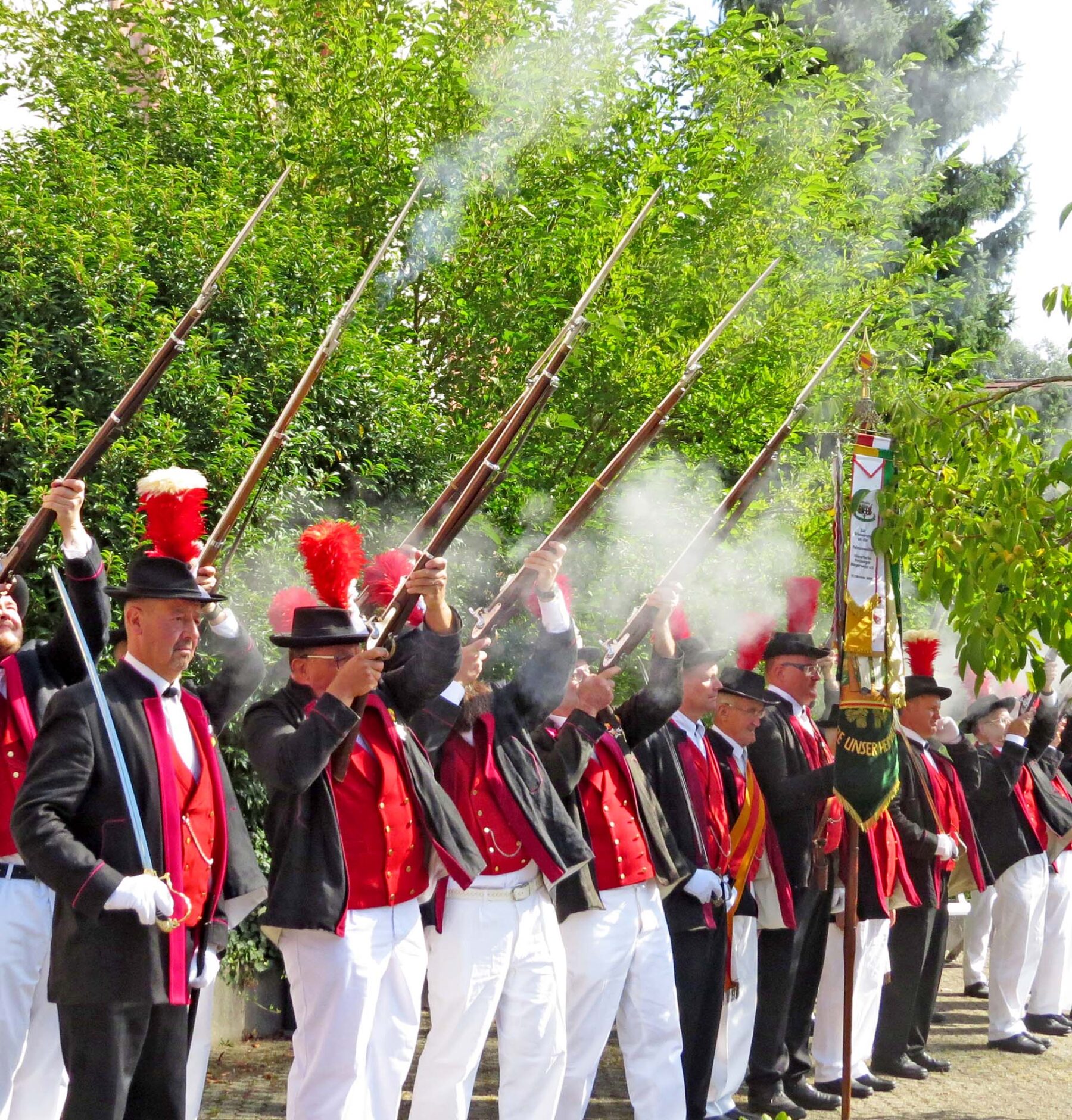 Zu einem nochmaligen Ehrensalut auf dem Kirchplatz für Pfarrer Gerner versammelten sich nochmals Zuschauer, die den Aufmarsch der Vereine gerne als Fotomotiv nutzten.