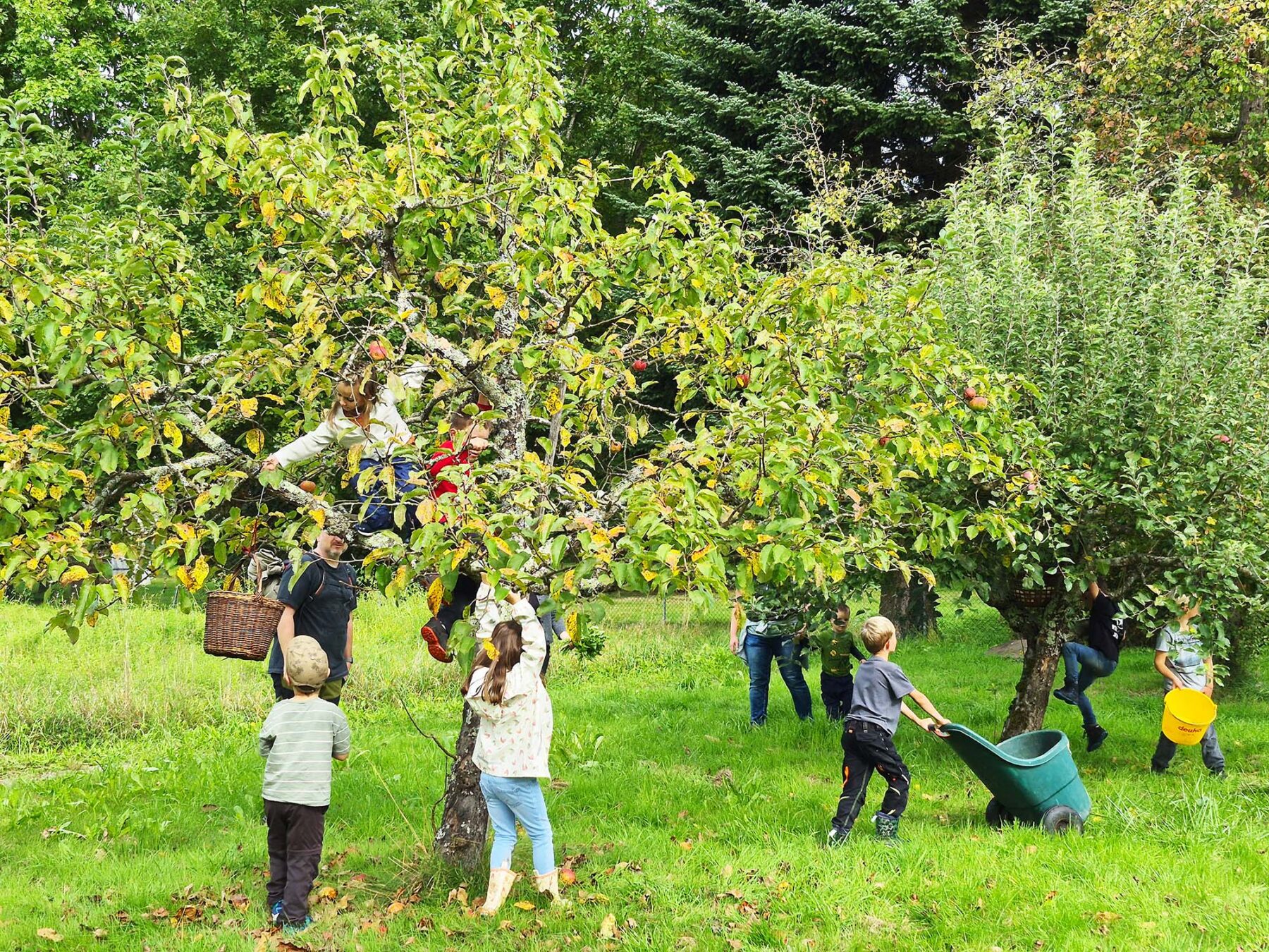 Einige Kinder klettern in die Bäume der Streuobstwiese, um an die reifen Äpfel zu gelangen.