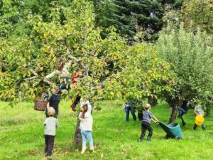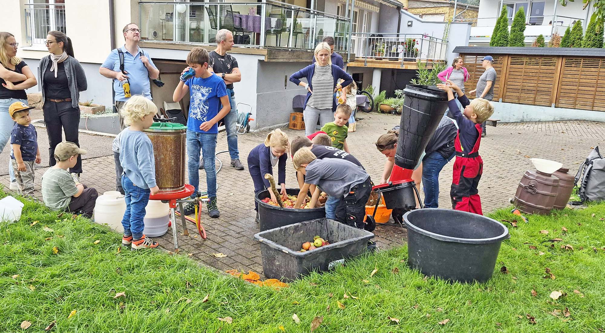 Im Mittelpunkt stand jedoch die Apfelernte. Mit Eifer pflückten die Kinder die Früchte, wuschen sie, warfen sie in den Muser zum Zerkleinern und halfen anschließend beim Pressen in einer kleinen hydraulischen Obstpresse. Zur Belohnung gab es frischen Apfelsaft, der gemeinsam mit Datschkuchen probiert wurde.