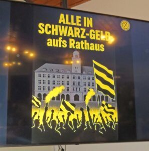 Der Verein wird sein Anliegen bezüglich des Platzbedarfs und der Nutzungsvertragsverlängerung in die Kommunalpolitik bringen, d.h. an eine der nächsten Gemeinderatssitzungen teilnehmen und die Interessen vortragen. Dazu gab es eine klare Ansage, die auf der Leinwand dargestellt wurde: „Alle in Schwarz-Gelb aufs Rathaus.“