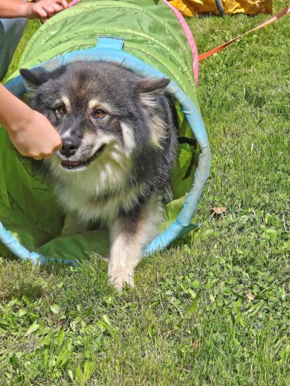 Ein „Hopp“ – und schon springt der Hund über die Hürde. Mal saust er durch einen Tunnel, mal sucht er konzentriert nach versteckten Gegenständen. Am Rand stehen Kinder, die gebannt zuschauen. Wenig später sind sie selbst an der Reihe. Sie dürfen den Tieren Kommandos geben und erleben, wie gut Mensch und Hund zusammenarbeiten können.