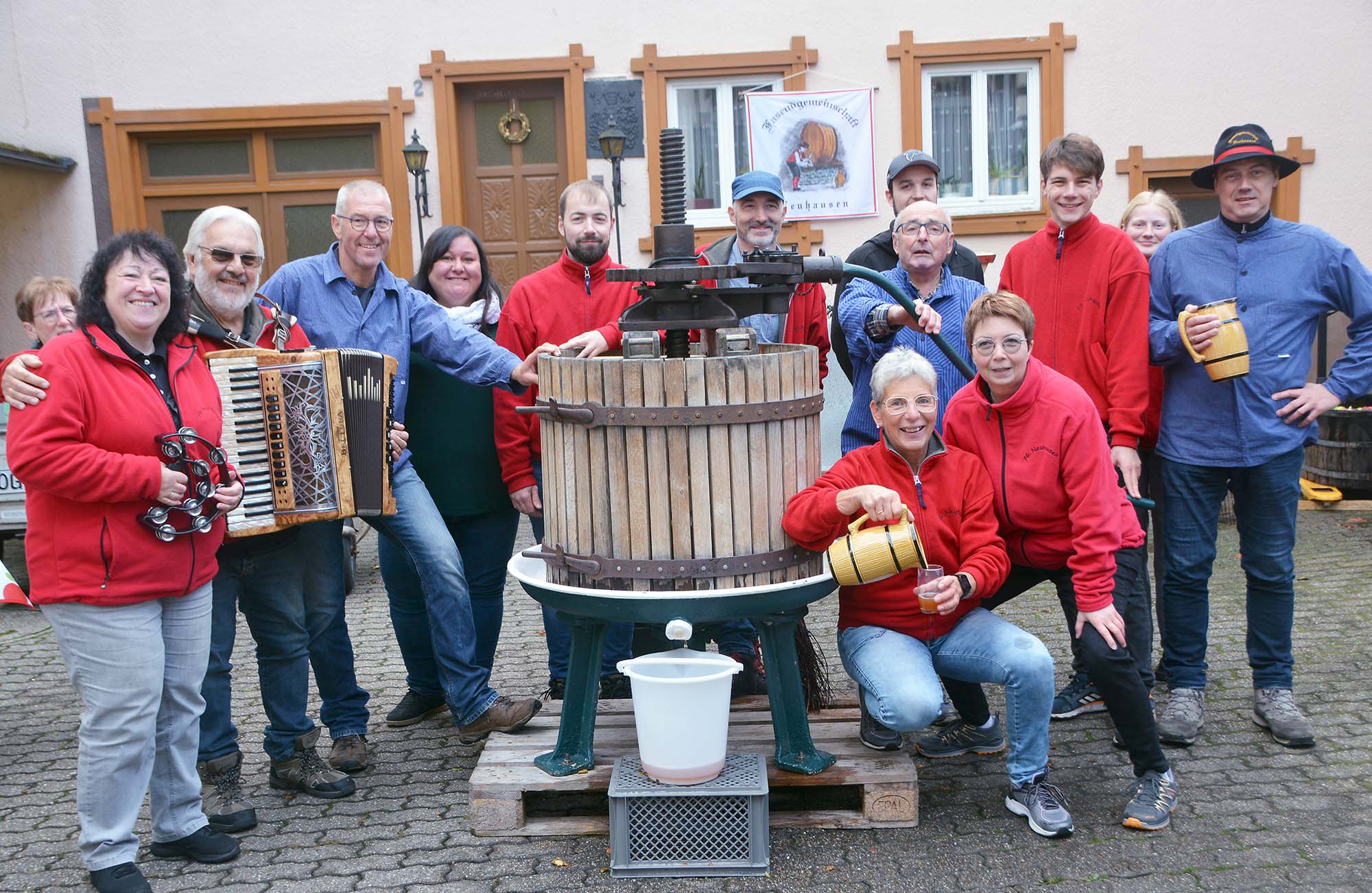 Die Neuhauser Narren um ihren Gemeinschaftsführer Klaus Kienzle (rechts) sind am Samstag beim Mostfest auf dem Kanzleiplatz wieder im Großeinsatz. Beim Trotten nach alter Väter Sitte schauen die Marktbesucher immer wieder gerne zu. Foto: .Archivfoto: Hanspeter Schwendemann
