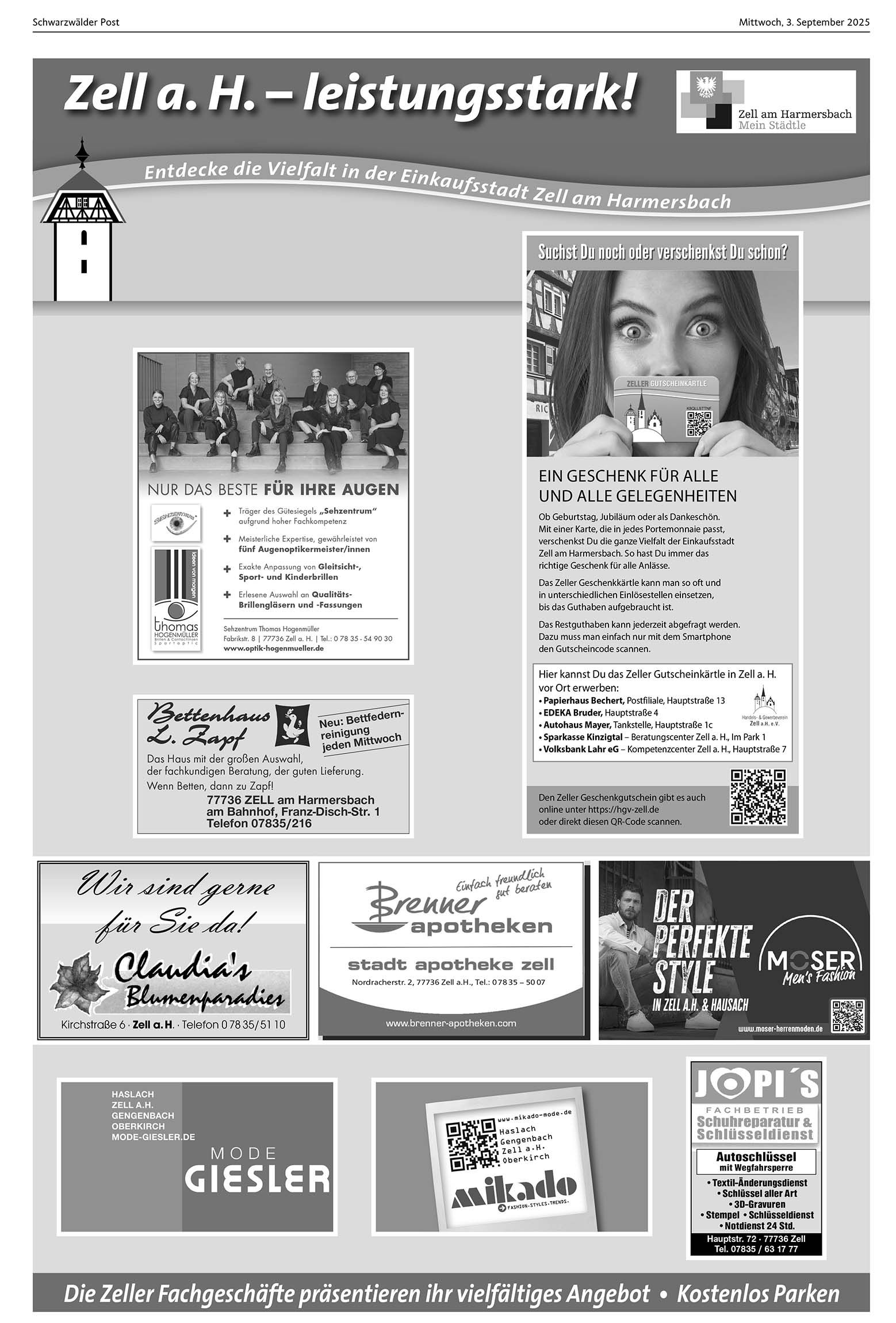 - Anzeige -Anzeige, Zell am Harmersbach | 3.09.2025 Zell a. H. – leistungsstark! Foto: Foto: SP von Schwarzwälder PostEntdecke die Vielfalt in der Einkaufsstadt Zell am Harmersbach. Das könnte Sie auch interessieren:Figurenspaß für Kinder: Mullewapp zu Gast in ZellBlasorchester Biberach: Festliches „Best…Blasorchester lädt zum Adventskonzert ein