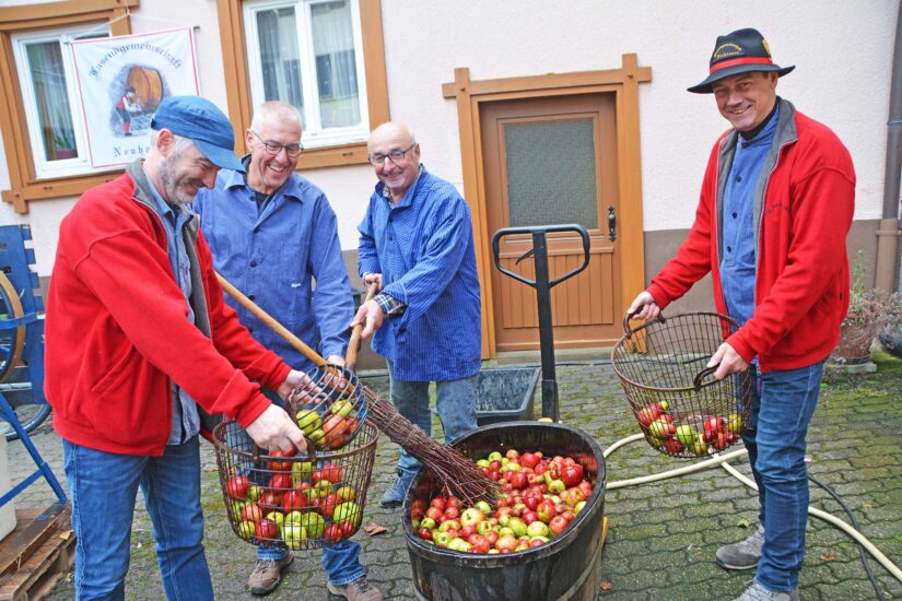 Die Neuhauser Narren um ihren Gemeinschaftsführer Klaus Kienzle (rechts) sind am Samstag beim Mostfest auf dem Kanzleiplatz wieder im Großeinsatz. Beim Trotten nach alter Väter Sitte schauen die Marktbesucher immer wieder gerne zu. Foto: Archivfoto: Hanspeter Schwendemann