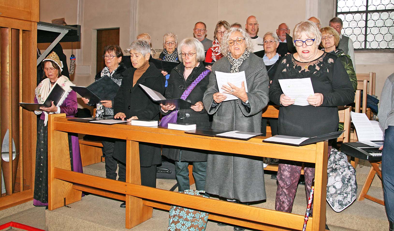 Der Gesangverein Frohsinn brachte sich mit mehreren Liedvorträgen in die Gottesdienst-Feier ein. Darunter der Titel „Mut zur Menschlichkeit“, der auf seine Weise beim Volkstrauertag die Friedensliebe ins Spiel bringt. Aber auch das Kirchenlied „Meine Zeit steht in deinen Händen“ wurde mehrstimmig vorgetragen. Geleitet wird der Chor von Alexandra Lauer.