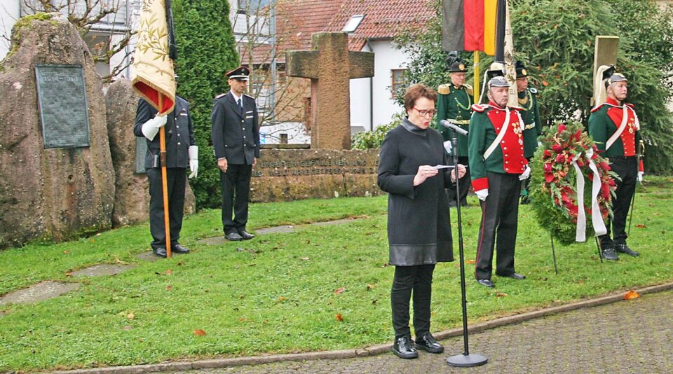 Nach dem Gottesdienst begaben sich die Formationen und Blaskapelle sowie die Gottesdienstbesucher zum Kriegerdenkmal auf der Ostseite der Kirche. Hier hielt Bürgermeister-Stellvertreterin Dr. Brigitte Stunder die Gedenkrede, die hier auszugsweise wiedergegen wird: „Vor genau 100 Jahren wurde zum ersten Mal der Volkstrauertag begangen, um an die gefallenen Soldaten des 1. Weltkriegs zu erinnern. Lassen Sie uns gemeinsam gedenken: An zehn Millionen gefallene Soldaten im 1. Weltkrieg und 24 Millionen im 2. Weltkrieg. An Gruppen und Völker, die wegen ihrer abweichenden Überzeugung oder Religion getötet wurden. An Menschen, die wegen ihrer anderen Hautfarbe oder Nationalität ermordet wurden. An Menschen, die politisch verfolgt oder Opfer von Terror wurden. An Menschen, die durch Hass und Gewalt ums Leben gekommen sind, weil sie zu kraftlos waren, um sich zu wehren oder weil sie Fremde waren. An Vater und Söhne, die wegen Ruhm, Ehre und Macht der Herrschenden ihr Leben verloren. An Mütter und Kinder, die vom Bombenhagel überzogen wurden und sich nicht rechtzeitig in Sicherheit bringen konnten. Seit mehr als 2000 Jahren werden von Menschen Kriege geführt, ohne Sinn und Verstand. Vergessen wir darüber nicht, dass nicht Krieg, sondern Frieden Freiheit bedeutet. Wir wollen uns darum bemühen, Tag für Tag in Familie, Stadt, Land und auf der ganzen Welt.“
