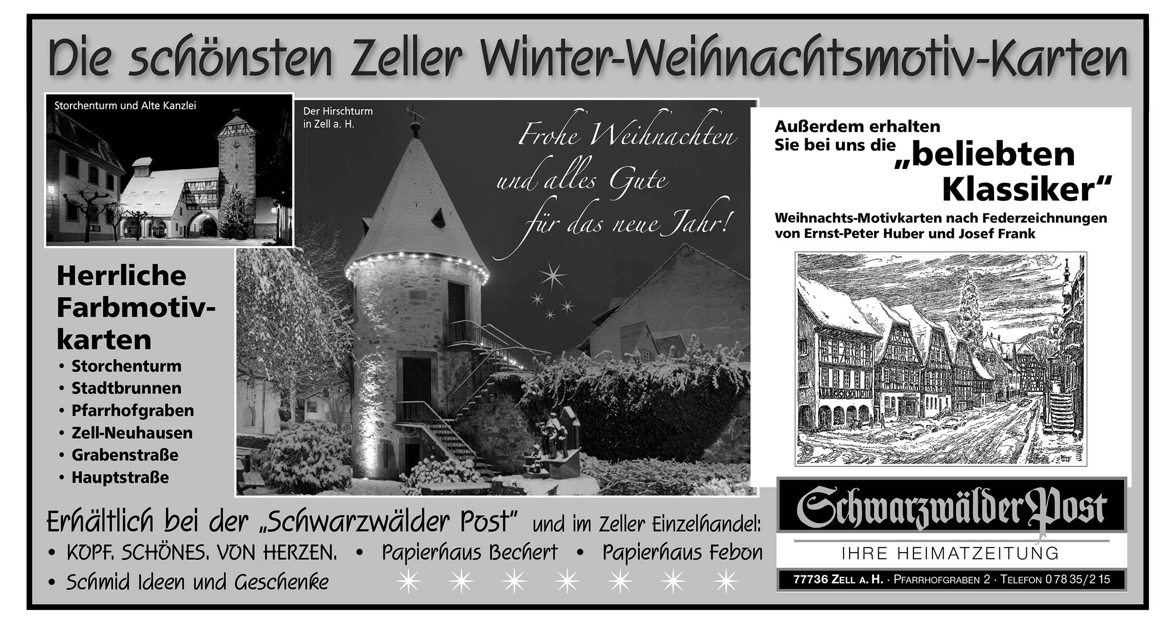 Zell am Harmersbach | 28.11.2025 Die schönsten Zeller Winter-Weihnachtsmotiv-Karten Foto: Foto: SP von Schwarzwälder Post Das könnte Sie auch interessieren:Foto: privatGoldenes Leistungsabzeichen: Zwei…ZFV müht sich zum UnentschiedenZeller FV siegt in Mühlenbach