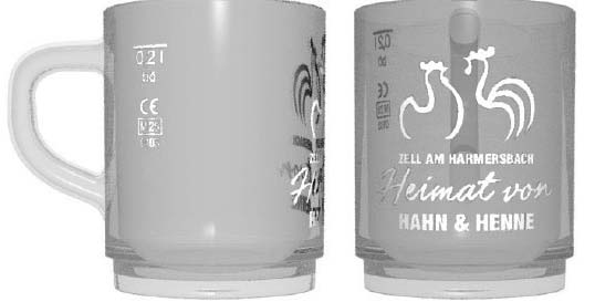 Die Stadt Zell führt eine neue Glastasse im „Hahn-und-Henne“-Design ein.