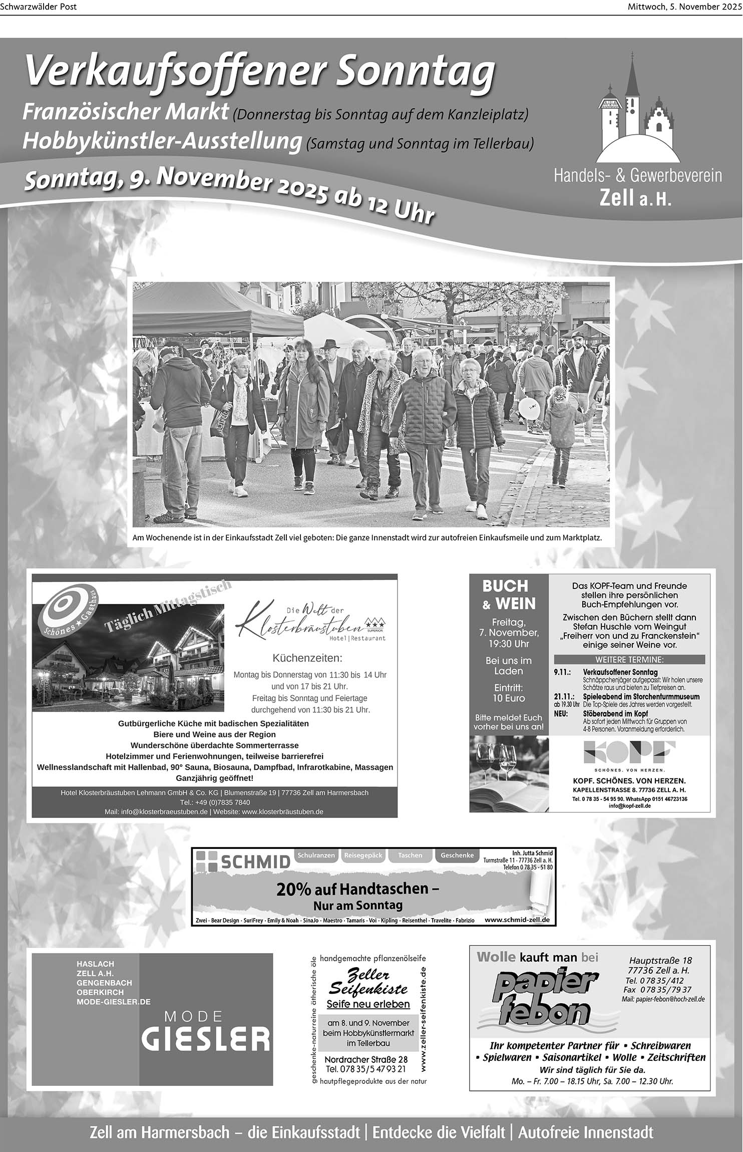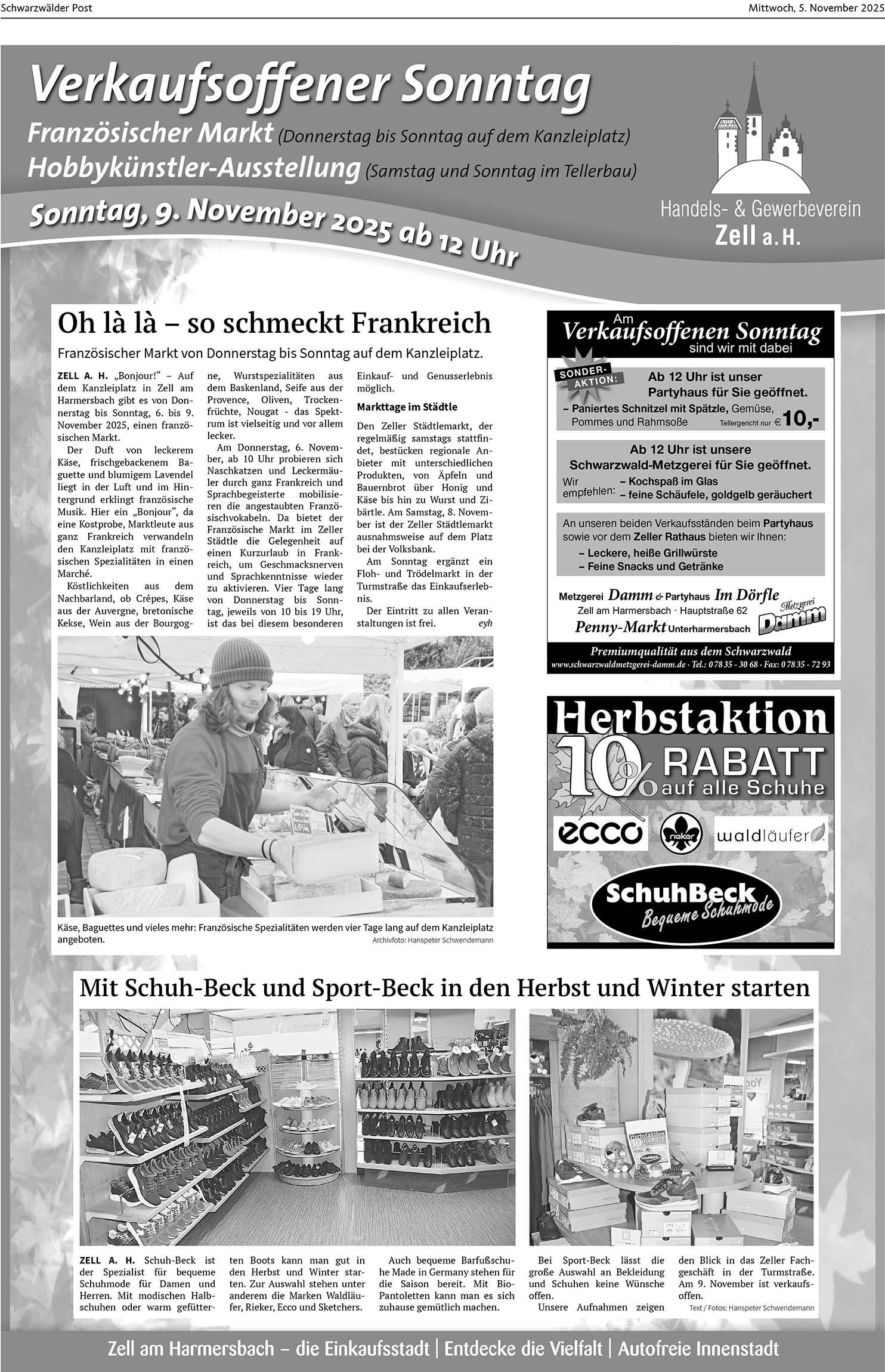 Zell am Harmersbach | 5.11.2025 Verkaufsoffener Sonntag Foto:Am Wochenende ist in der Einkaufsstadt Zell viel geboten: Die ganze Innenstadt wird zur autofreien Einkaufsmeile und zum Marktplatz. Foto: SP von Schwarzwälder PostAm Wochenende ist in der Einkaufsstadt Zell viel geboten: Die ganze Innenstadt wird zur autofreien Einkaufsmeile und zum Marktplatz. Foto: SP Foto: SP Foto: SP Foto: SPDas könnte Sie auch interessieren:Foto: privatSo blicken die Bürgermeister ins Jahr 2026Foto: VereinJahresfeier zeigt die ganze BandbreiteVolles Programm für den SKC –…