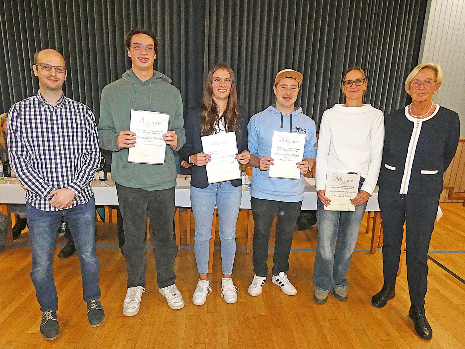 Sybille Nock (rechts) und Pirmin Serrer (von links) mit den vom Verband geehrten Volleyballern: Julius-Constantin Rumpel, Julia-Cecil Rumpel, Patrick Matt, Mandy Rumpel. Foto: Inka Kleinke-Bialy