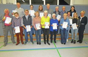Vorsitzende Sybille Nock (rechts) mit jenen, die ihre Vereinsehrung persönlich entgegennehmen konnten: Vordere Reihe (von links): Wolfgang Spitzmüller, Winfried Schwarz, Jan Werbeck, Bettina Grillich, Lilo Schwarzer, Bärbel Heitzmann, Gerlinde Heizmann, Kerstin Teufel. Hintere Reihe: Karl-Heinz Nock, Noah Wegner, Meike Heizmann, Michael Mietzner, Ludwig Scherer, Dieter Petri, Miriam Ittner, Selina Volk. (Auf dem Foto fehlt: Ulrich Saade).