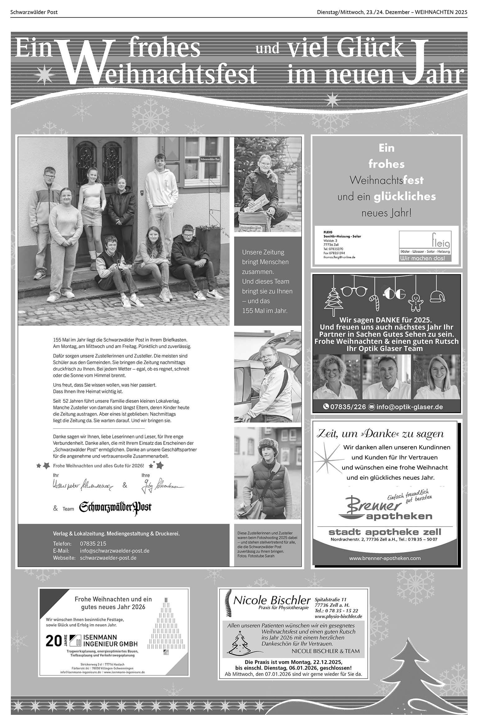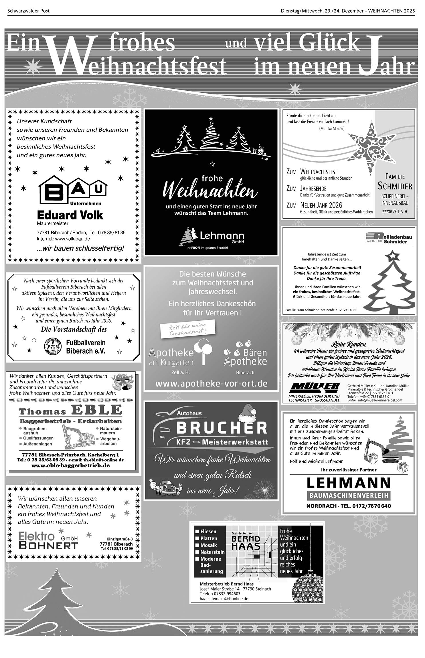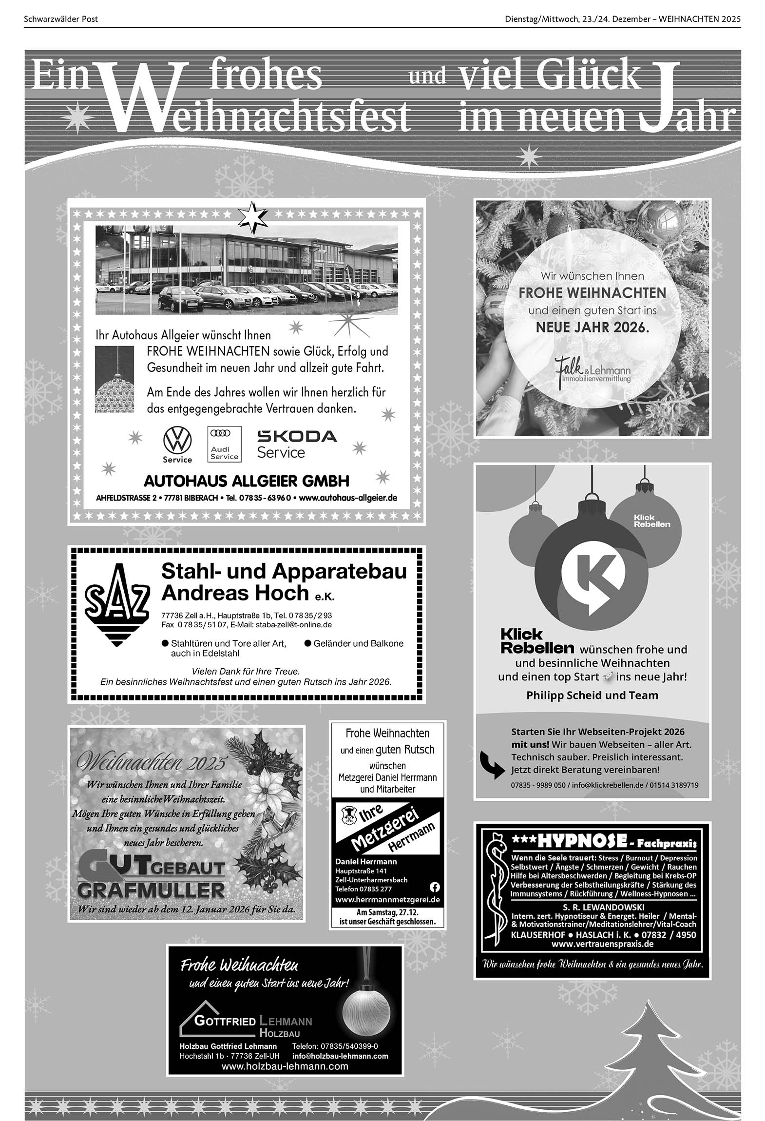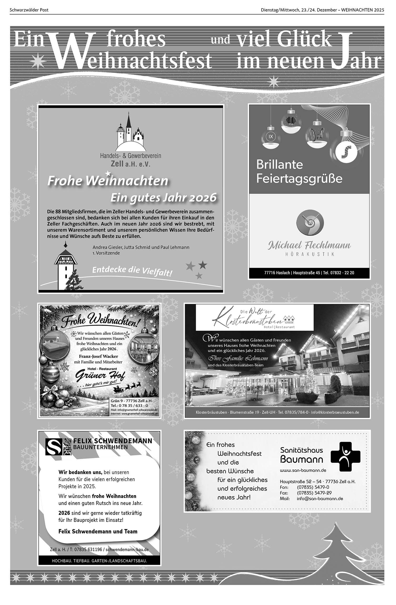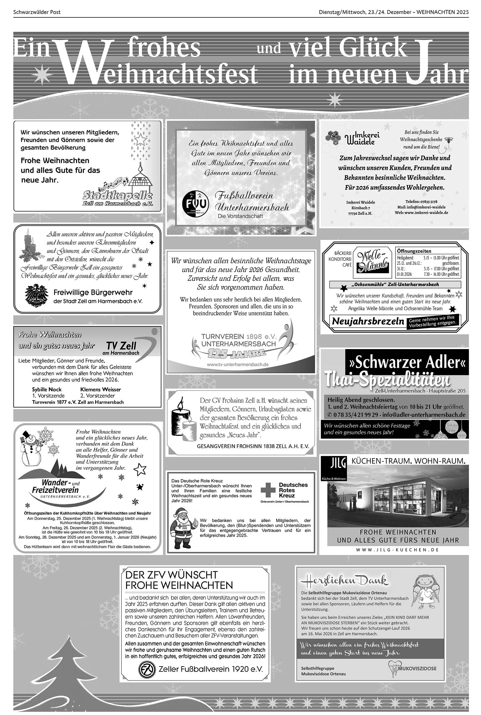 - Anzeige -Zell am Harmersbach | 23.12.2025 Ein frohes Weihnachtsfest und viel Glück im neuen Jahr von Anne-Kathrin Heizmann Foto: Schwarzwälder Post Foto: Schwarzwälder Post Foto: Schwarzwälder Post Foto: Schwarzwälder Post Foto: Schwarzwälder PostDas könnte Sie auch interessieren:Foto: VeranstalterKrippenspiel in der PfarrkircheFoto: Archivfoto: Hansjörg WörnerWeihnachtskonzert mit Blick auf Kerkrade 2026Foto: Robert SchwendemannOberharmersbach glitzert im Advent