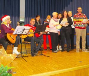 Einige Mitarbeiter beziehungsweise Rentner hatten Weihnachtslieder vorbereitet und stimmten sie als große Gruppe auf der Bühne an. Von der Sangeslust ließ sich das Publikum im Saal gerne anstecken. Es entstand ein großer Chor und besonders weihnachtliche Stimmung. Danach gab es reichlich Gelegenheit zu Begegnung und Gespräch; die Mitarbeiter erlebten einen vergnüglichen Abend.