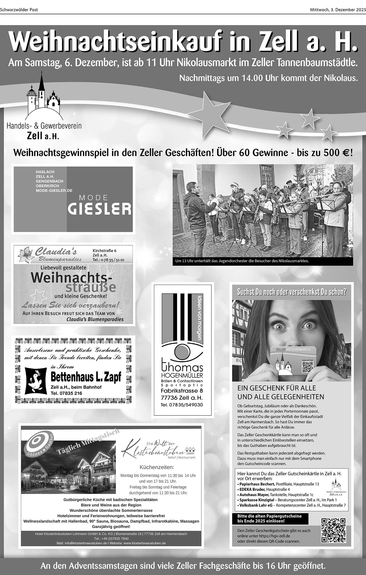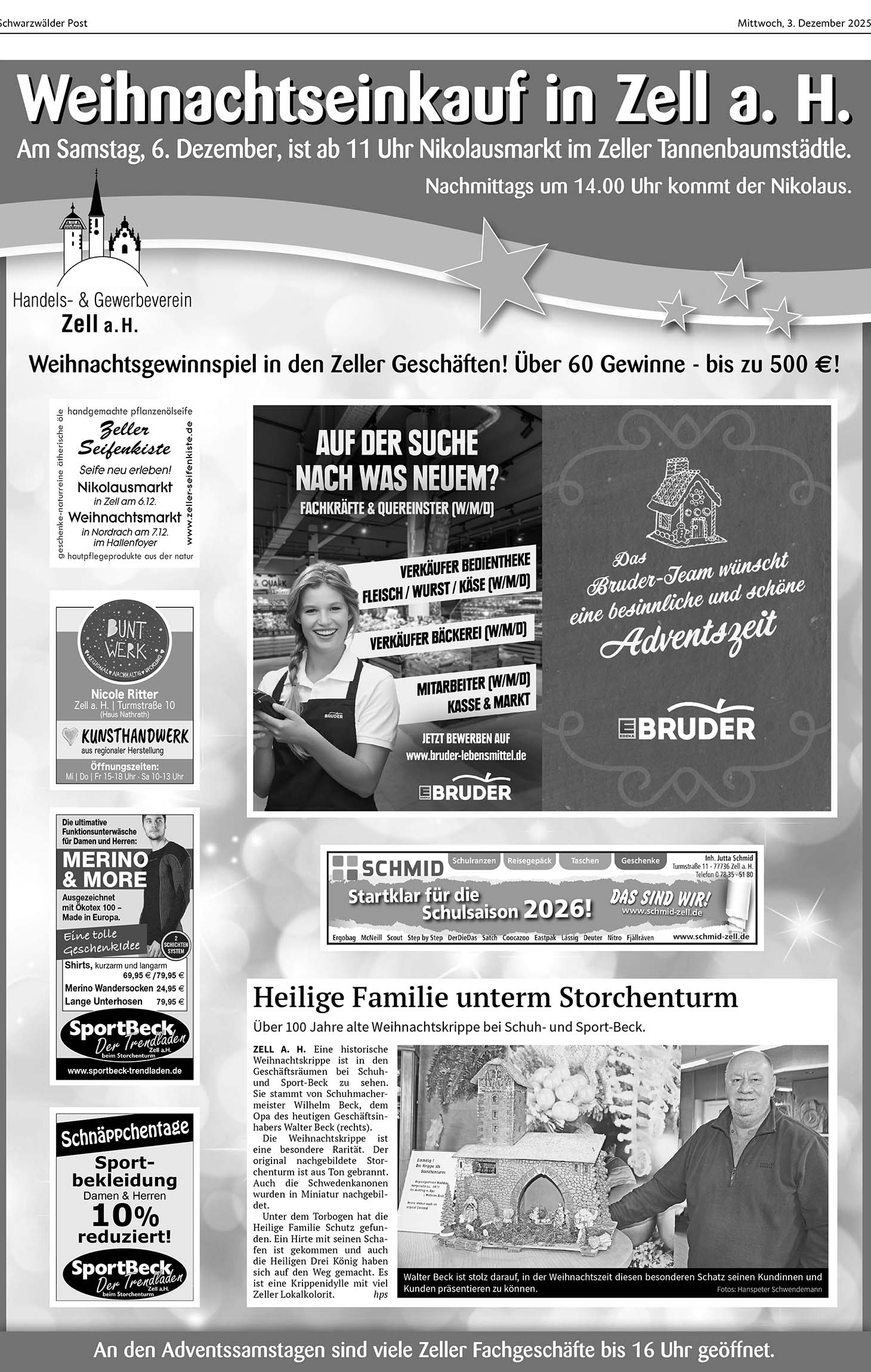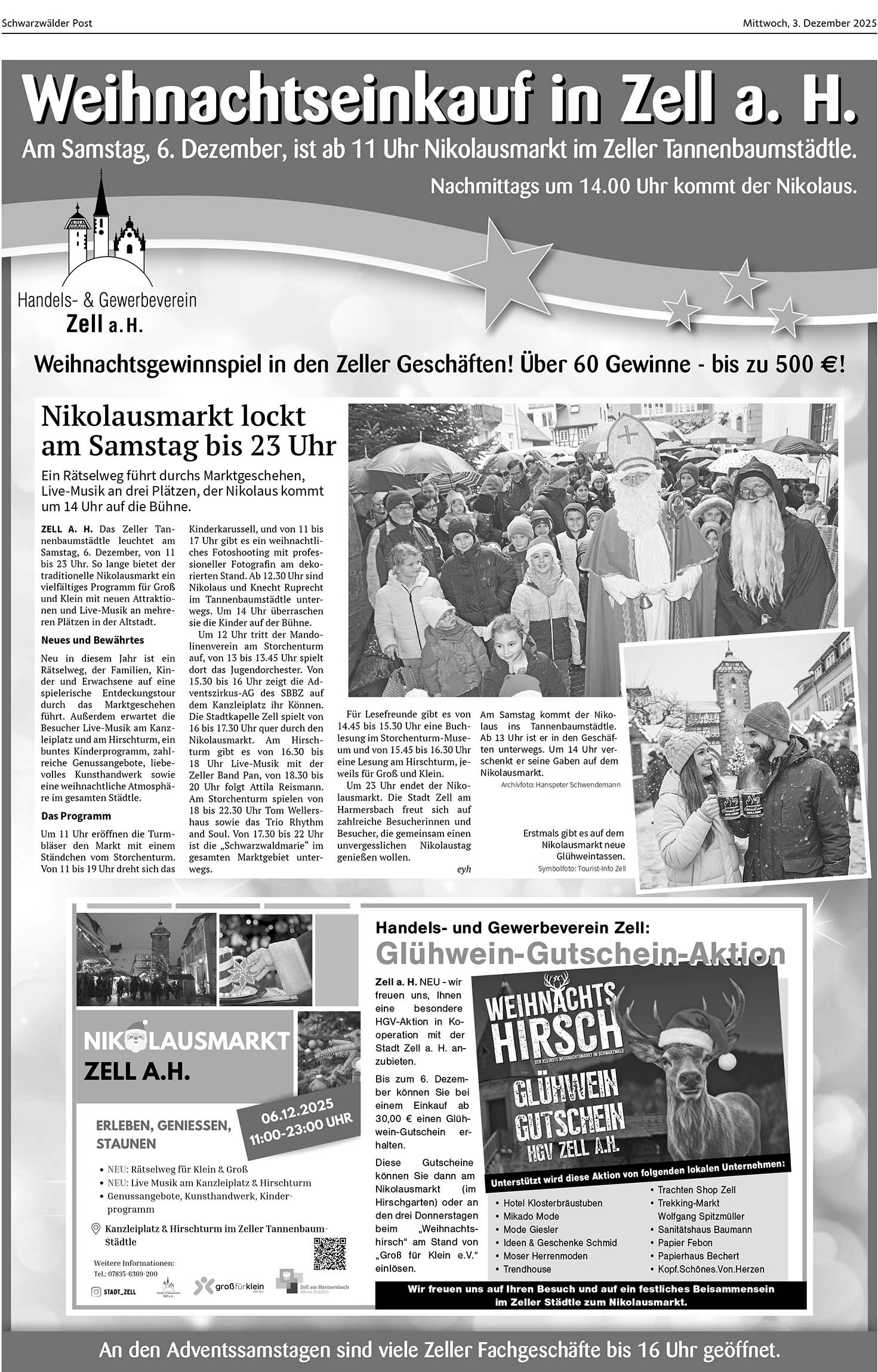 Zell am Harmersbach | 3.12.2025 Weihnachtseinkauf in Zell a. H. Foto:Am Samstag kommt der Nikolaus ins Tannenbaumstädtle. Ab 13 Uhr ist er in den Geschäften unterwegs. Um 14 Uhr verschenkt er seine Gaben auf dem Nikolausmarkt. Foto: Archivfoto: Hanspeter Schwendemann von Schwarzwälder PostAm Samstag, 6. Dezember, ist ab 11 Uhr Nikolausmarkt im Zeller Tannenbaumstädtle. Nachmittags um 14.00 Uhr kommt der Nikolaus Foto: SP Foto: SP Foto: SP Foto: SPDas könnte Sie auch interessieren:Foto: Hanspeter SchwendemannDas Tannenbaumstädtle erstrahlt in…Foto: HeimatlichterRätselweg führt Kinder über den NikolausmarktFoto: Archivfoto: VereinDer Nikolaus kommt zum Turnverein Biberach