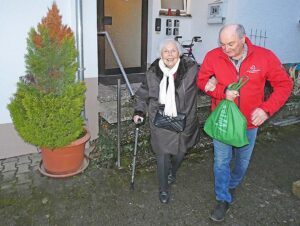 Hilda Hermann – Altwirtin des ehemaligen Gasthofs Kreuz – freut sich, wenn sie von einem Fahrer der Sozialstation (hier von Ulrich Bleier) „befördert“ wird.