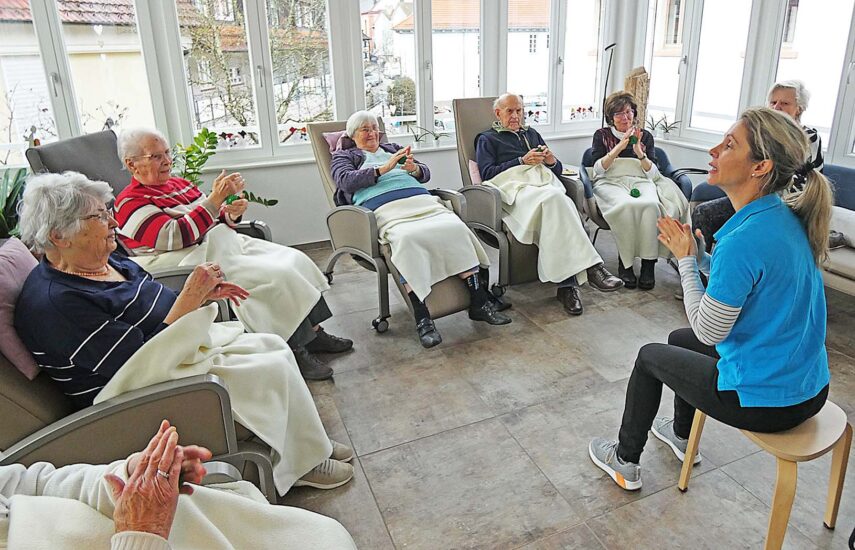 Letzteres funktioniert im Sitzen auch mit der Gruppe im Erdgeschoss. Wer nicht mitmachen kann, schaut einfach zu: Da werden unter Sarahs und Alines Anleitung die Hände gerieben und wird mit den Schultern gekreist und mit den Füßen gestampft, „und jetzt rennen wir, immer schneller.“ Die Füße geben her, was sie können und wollen, und sei es in Zeitlupe. Nun ist allen warm und es heißt: „Jetzt trinken wir einen großen Schluck.“