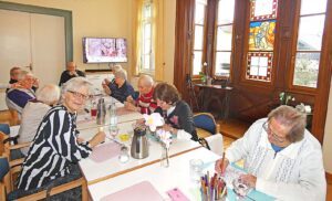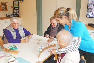 Nach einem Joghurt als Zwischenmahlzeit geht es nebenan ins „Sonnenstüble“. Hier schließt sich nach der zuvor körperlichen eine nun geistige Aktivierungsrunde an. Eine der Betreuerinnen liest beispielsweise aus der Tageszeitung vor. Gedächtnis- und Erinnerungsarbeit wird betrieben, um Gespräche und Gedächtnistraining zu fördern, es gibt Bastelangebote, auch seniorengerecht gestaltete Gesellschaftsspiele sind beliebt. Ein solches Programm führt Betreuerin Sandra soeben im ersten Stock mit den fitteren Schützlingen durch.