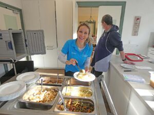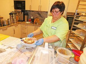 So schnell vergeht an dem heutigen Vormittag die Zeit, dass es scheinbar ruckzuck Zeit für´s Mittagessen ist. Das wird vom Seniorenzentrum St. Gallus angeliefert. Ein Besuch bei dessen Hauswirtschaftsleiterin Anna Schmid ergibt: Rund 300 Mahlzeiten werden hier täglich frisch zubereitet, aus weitgehend regionalen Zutaten. Empfänger sind neben der Sozialstation unter anderem das Betreute Wohnen und umliegende Dörfer.