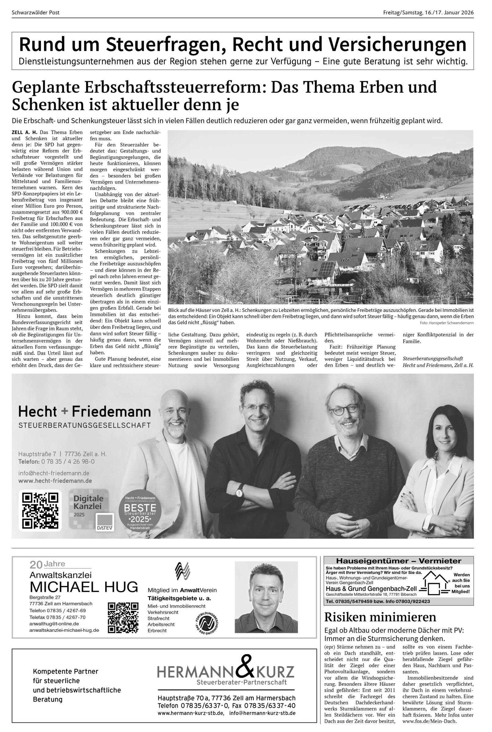 Blick auf die Häuser von Zell a. H.: Schenkungen zu Lebzeiten ermöglichen, persönliche Freibeträge auszuschöpfen. Gerade bei Immobilien ist das entscheidend: Ein Objekt kann schnell über dem Freibetrag liegen, und dann wird sofort Steuer fällig – häufig genau dann, wenn die Erben das Geld nicht „flüssig“ haben. Foto: Hanspeter Schwendemann