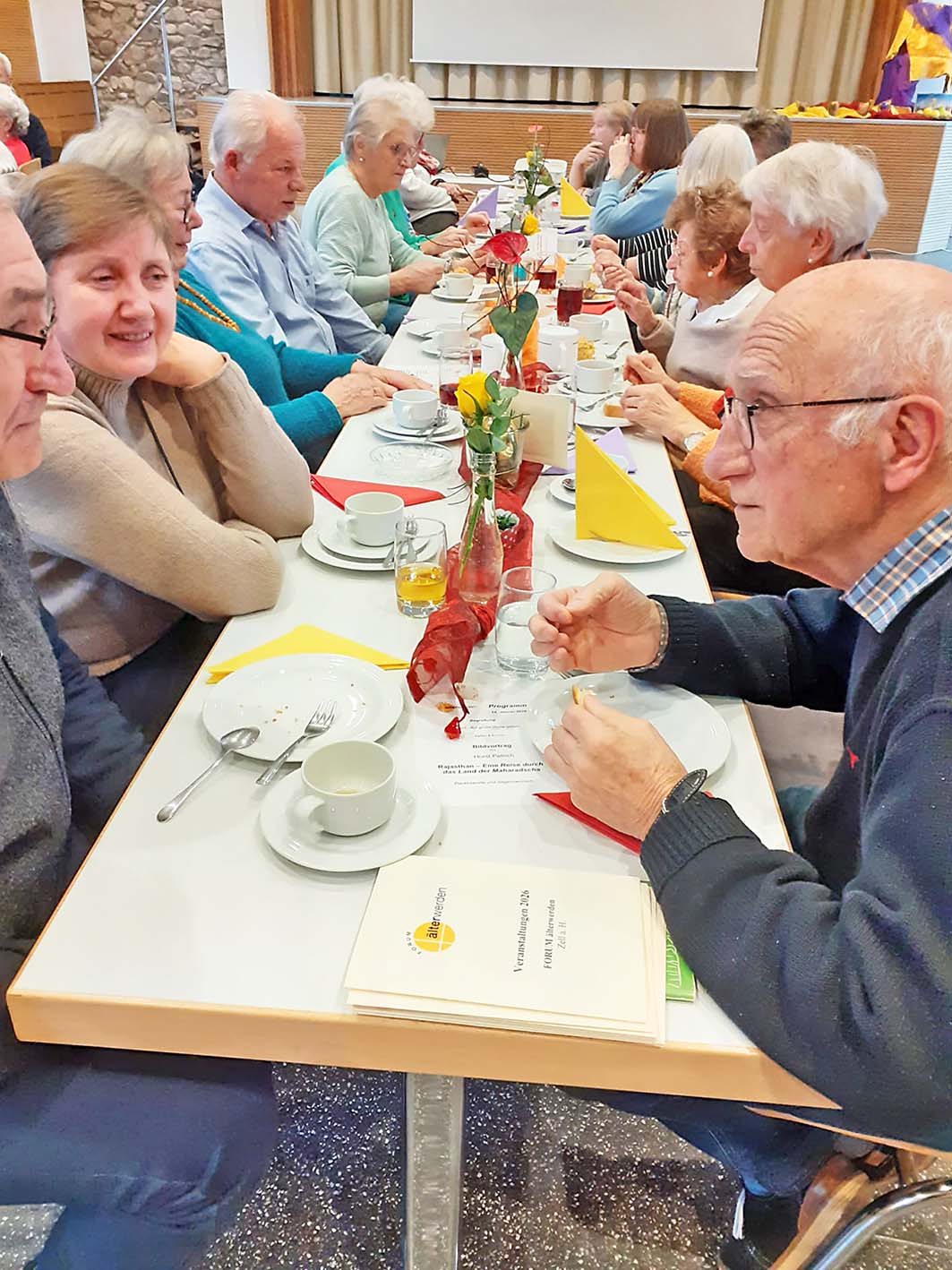 Bunt dekorierte Tische im Pfarrheim ließen bereits beim Eintreten erkennen, dass dieser Seniorennachmittag unter einem besonderen Motto stand. Nach der Begrüßung der zahlreich erschienen Seniorinnen und Senioren durch das Leitungsteam von FORUM älterwerden wurde der Nachmittag mit einer Gedenkminute eröffnet. In stillem Erinnern wurde dabei vier Seniorinnen und Senioren gedacht, die im Jahr 2025 verstorben sind und über viele Jahre regelmäßig an den Veranstaltungen teilgenommen hatten.